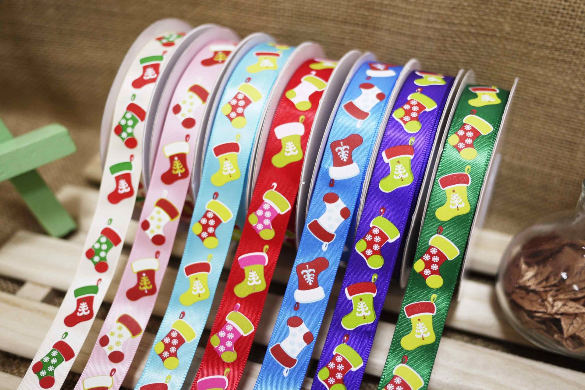 شريط ساتان بقياس 5/8 بوصة مع طباعة جوارب عيد الميلاد