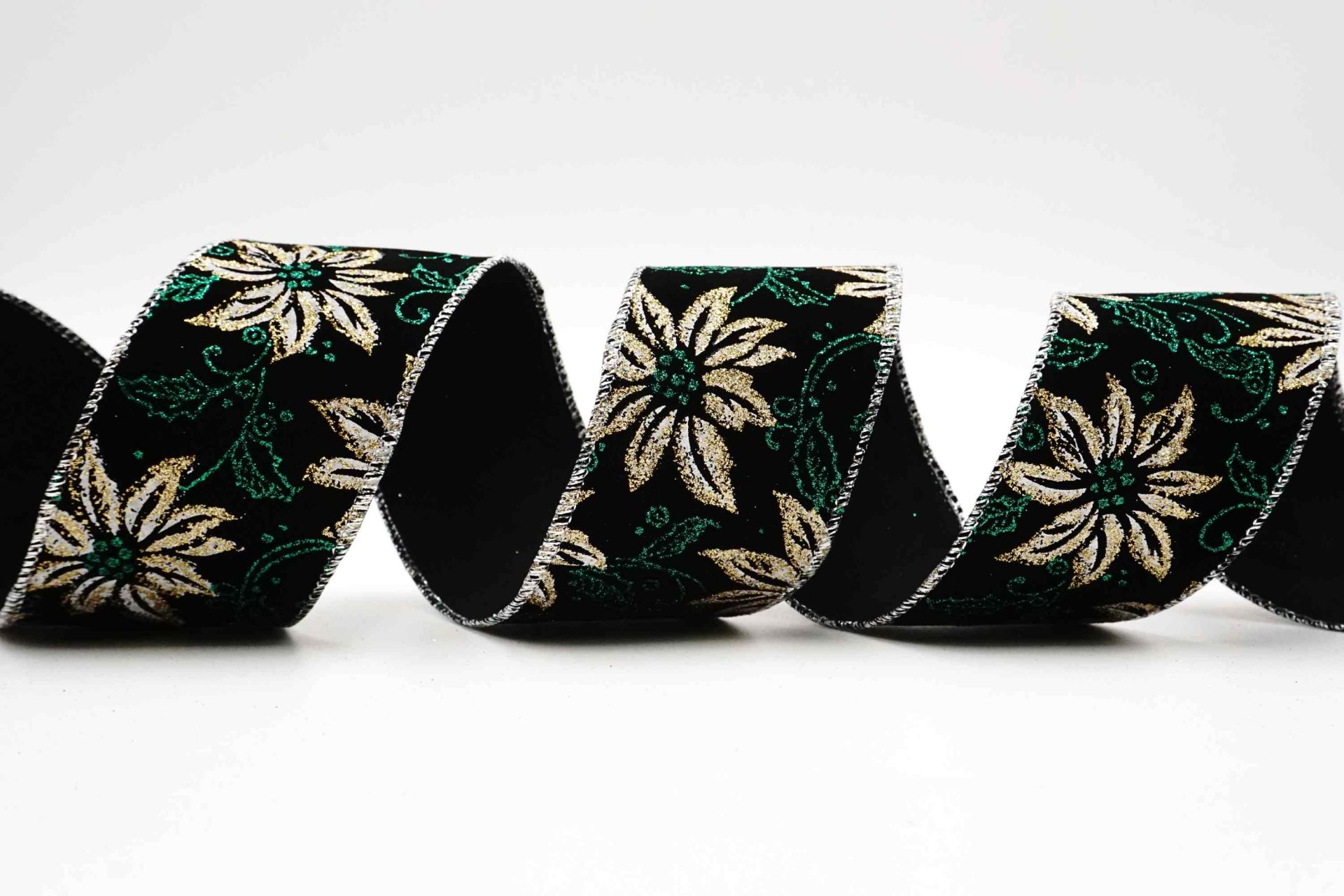 Das reichhaltige Samtband zeichnet sich durch eine weiche und opulente Textur aus. Es ist in vier Hintergrundfarben von hell bis dunkel erhältlich. Auf dem Band befinden sich große Weihnachtssternblumen, Stechpalmenblätter und kleine Beeren, die alle mit zwei Farben von Glitzer bemalt sind. Diese natürlichen Elemente können definitiv eine festliche Stimmung verleihen, während der Glitzer aus dem Samt hervorsticht.