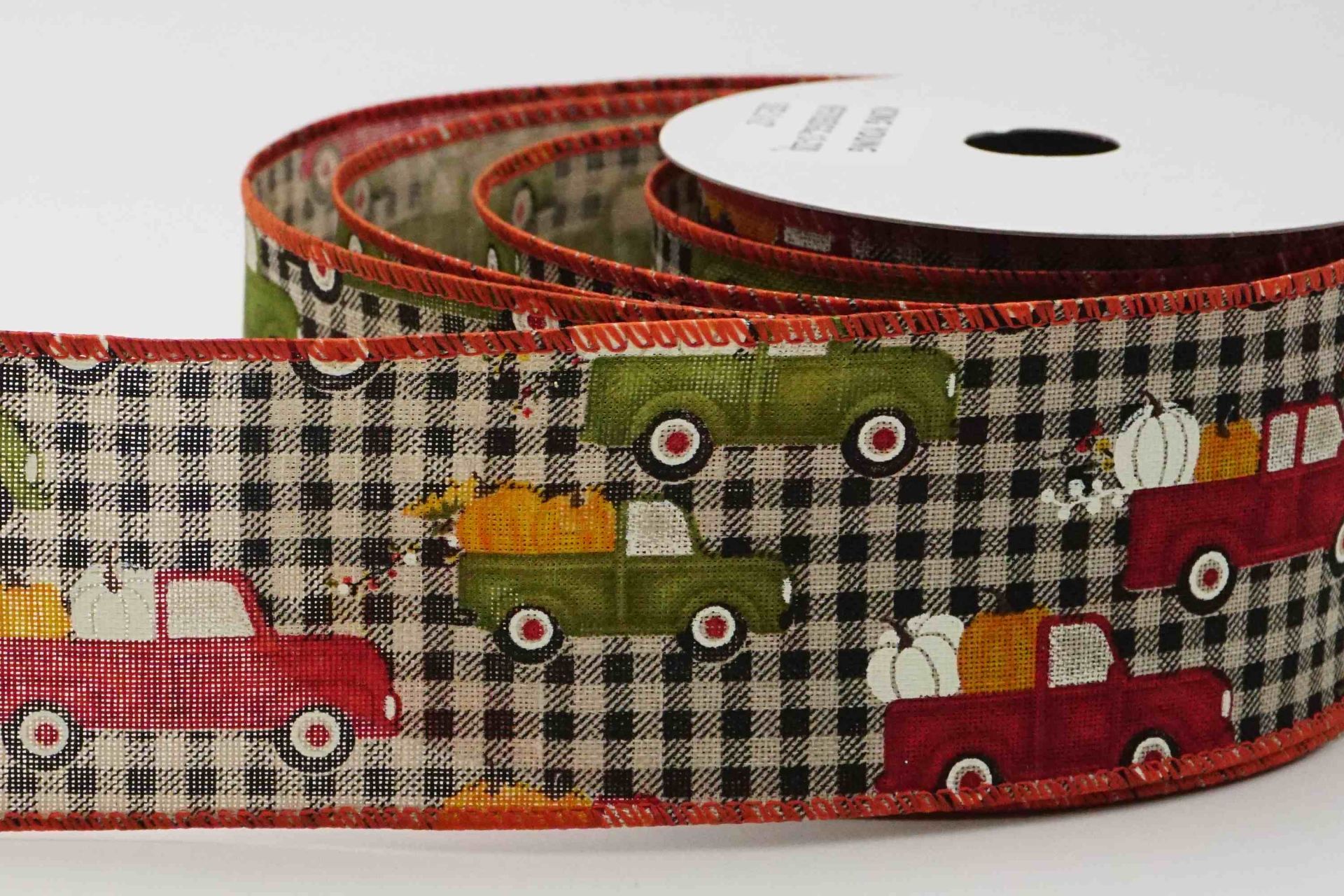 Dieses Vintage-Band ist eine rustikale Schönheit, inspiriert von der Herbstsaison. Diese verdrahtete Freude bringt die Vergangenheit in die Gegenwart und hilft Ihnen, sich in jede Kreation zu verlieben, die Ihr Herz begehrt. Dieses Band präsentiert den klassischen Rot/Grün Farm Truck mit den schimmernden goldenen orangefarbenen Kürbissen auf einem verdrahteten Randband.