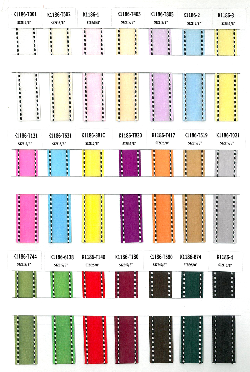 Another look of grosgrain ribbon with cute side stitching. The stitching is available in many colors to go with different grosgrain colors. So many colors to choose from and so much fun! The ribbon edge is non-wired. This ribbon is great for gift packaging, crafting, bows, wreaths, toys and more! We adopt eco-friendly practices to manufacture this ribbon. Ask us for color cards to check out the colors!