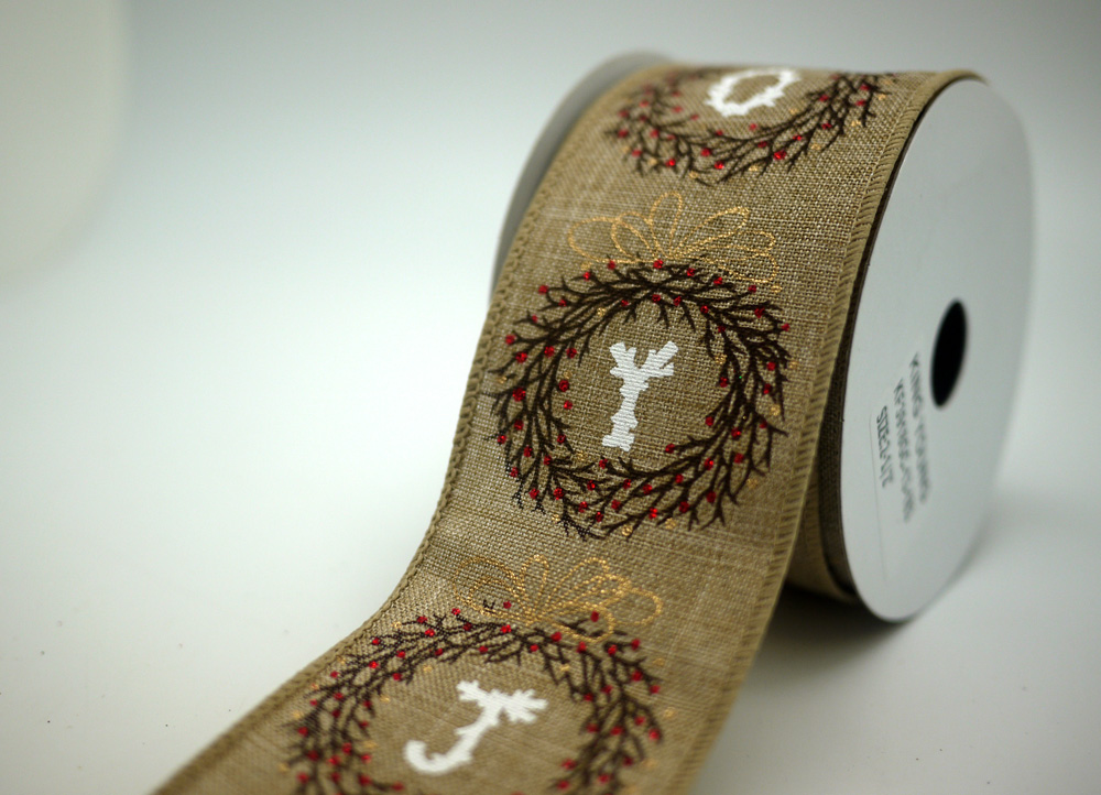 Christmas wreath ribbon features brown pine needle wreaths with gold bows on top and “J” “O” “Y” letters in the center.