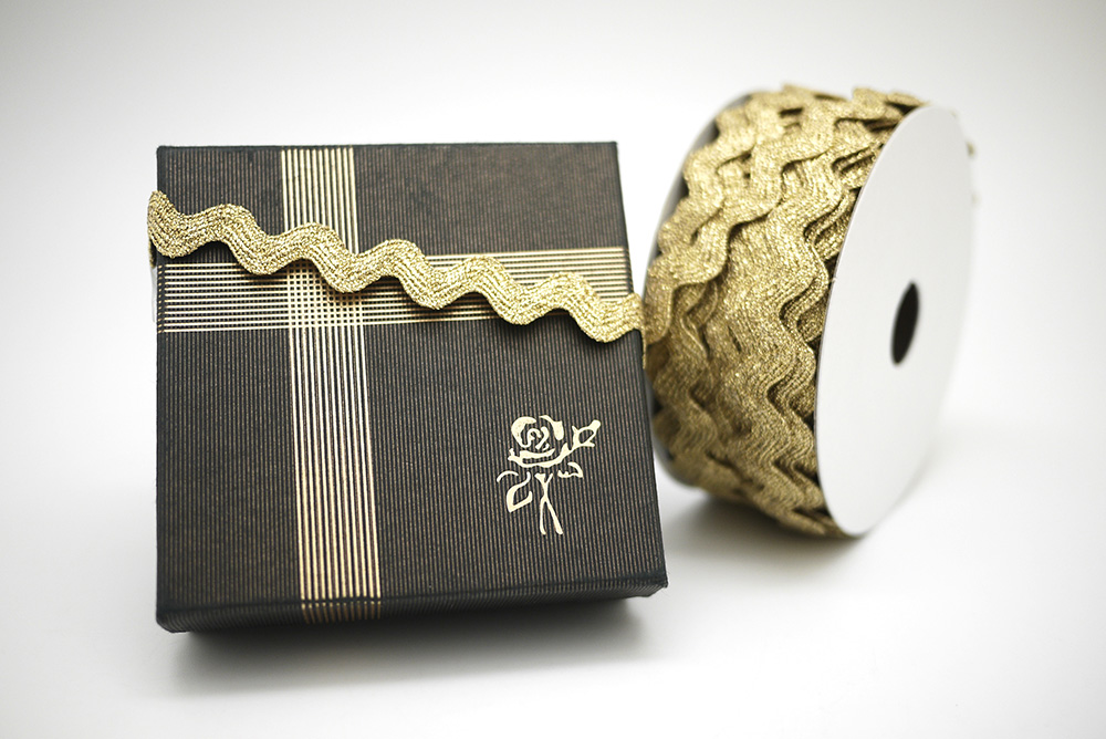 Metallic ric rac ribbon trim in 8mm width and comes in gold and pink/silver colors. Custom colors can be developed per request. Great quality. This metallic ric rac ribbon is an ideal addition to your gifts package, scrapbooking, craft & sewing projects, apparel, toy, hair bow and more!