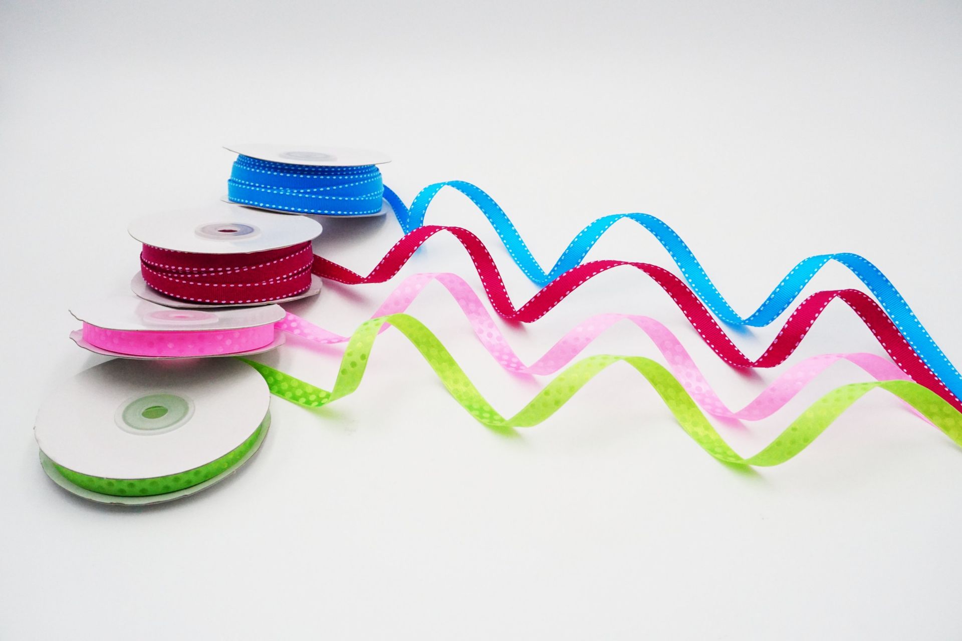 Este juego de cintas viene en un solo tamaño de 3/8 pulgadas, están mezcladas en 4 colores: verde manzana, rosa, azul y fucsia, y se pueden combinar fácilmente con varios adornos. Este animado juego de cintas estrechas incorpora un diseño de lunares y costuras laterales.
