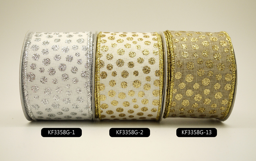 Divertidos puntos de diferentes tamaños impresos con brillante purpurina en tela de arpillera falsa. El borde de la cinta está cortado y cosido con hilo metálico a juego y contiene alambre para que puedas doblarlo y darle forma con facilidad. Disponible en 6 combinaciones de colores y todos los tamaños. ¡Añade un toque divertido y lindo a tu paquete de regalo, decoración, lazo, corona, arreglo floral y proyecto de manualidades con esta cinta festiva!