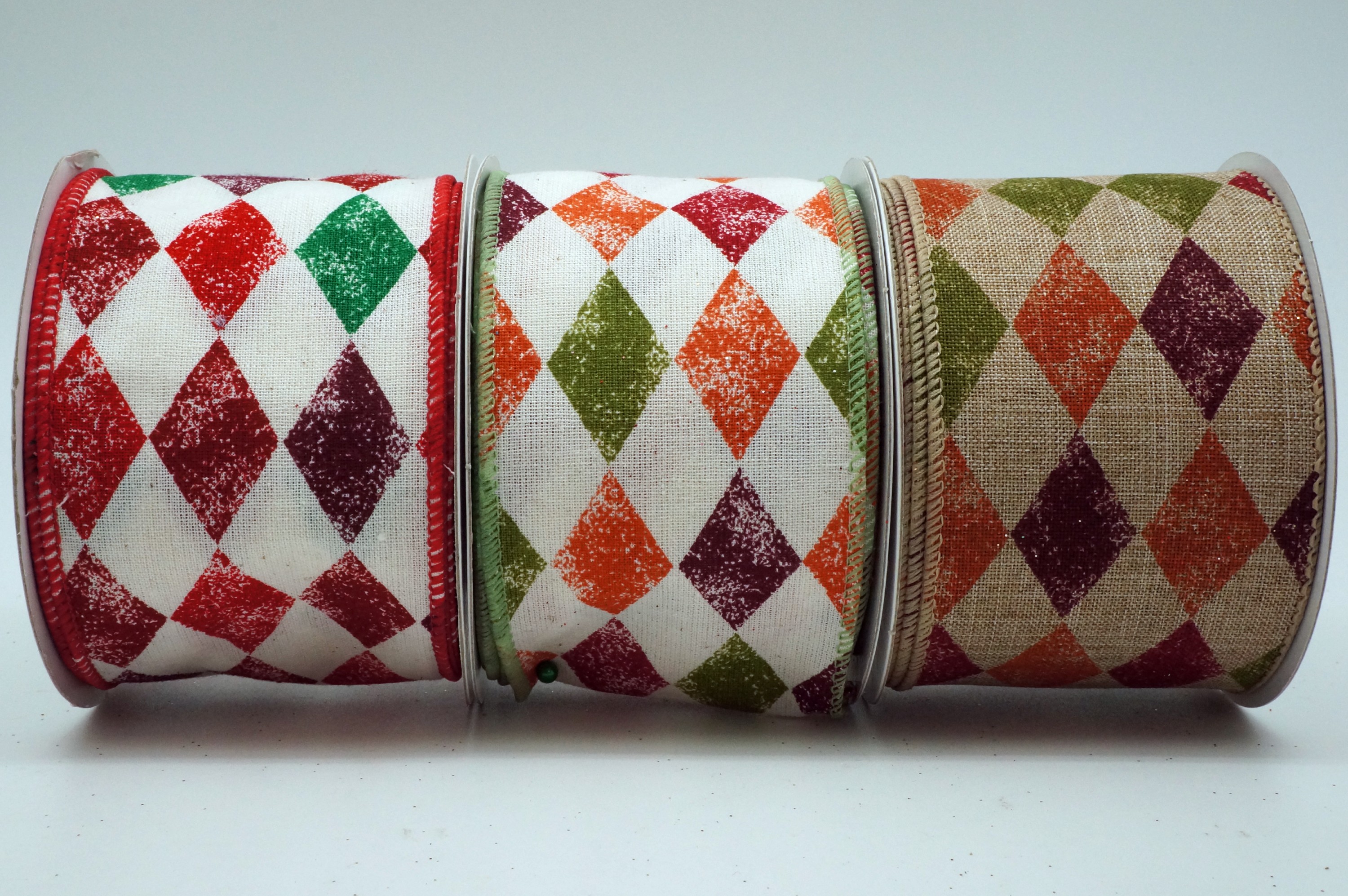 Il s'agit d'un ruban de vacances au style rétro amusant avec un motif à carreaux d'arlequin. Le motif à carreaux d'arlequin est imprimé avec un effet marbré sur un tissu en coton grossier. Ce ruban à carreaux d'arlequin présente des bords câblés finis avec un fil mat assorti pour aider le ruban à maintenir sa forme.