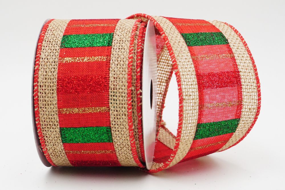 यहां एक और उदाहरण है क्रिसमस रिबन को अगले स्तर तक ले जाने का। इस हेसियन संयुक्त क्रिसमस रिबन की श्रृंगारिकता में हेसियन रिबन को अलग-अलग आकार और रंग की क्षैतिज पट्टियों से ढंका गया है। यह 4 रंग विकल्प प्रदान करता है, जिसमें सुंदर बरगंडी/सफेद पट्टियाँ, सोने/चांदी की चमकदार पट्टियाँ, क्रीमी लाल/पन्ना/सोने/आइवरी पट्टियाँ और पारंपरिक लाल/पन्ना/सोने/लाल पट्टियाँ शामिल हैं। पॉलिएस्टर, कॉटन और रेयॉन से बनी, यह हेसियन वास्तव में कठोर और टिकाऊ रिबन है।