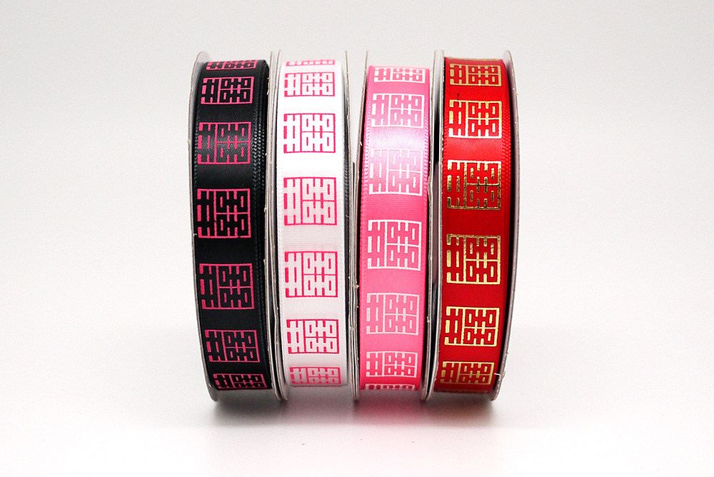 Nastro di raso singolo da 5/8 di pollice con una stampa di caratteri cinesi. Questo carattere cinese simboleggia "buona fortuna" e "doppia felicità" per il matrimonio. La stampa è progettata come un'immagine negativa e può essere realizzata con inchiostro opaco o foglia d'oro. Questo nastro stampato è ottimo per regali e decorazioni matrimoniali.