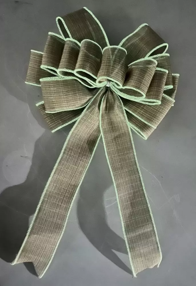 Additio mirabilis ad quodlibet donum vel ornatum. Cum artificio diligentiāque et elegantī formā, arcus iste certē pulchritūdinem creātiōnum tuārum augēbit. Mensurans latitudinem totalem viginti centimetrorum, sex circulos perfecte proportionatos habet, qui profunditatem et dimensionem ad eius speciem addunt. Duae caudae, quae utraque 25 cm longitudine metiuntur, gratiosissime decurrunt, eiusque venustatem amplificant. Fascia nodus praefertur cum nodo simplici in medio, facilius adnecti donis tuis vel ornamento.