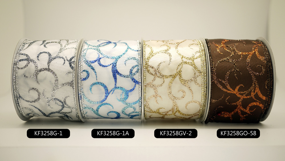 Klassieke rollen bedrukt in 3 tinten goud, rood, groen, zilver, blauw of bruin glitter op organza stof. De lintrand is genaaid met bijpassend metallic garen en bevat draad om de strikken hun vorm te laten behouden. Het is verkrijgbaar in 10 prachtige kleuren en alle maten. Voeg een sprankelende finishing touch toe aan uw kerstcadeauverpakking, decoratie, bloemstuk, strik, krans en interieurdecoratie met dit organza lint met scrolls!