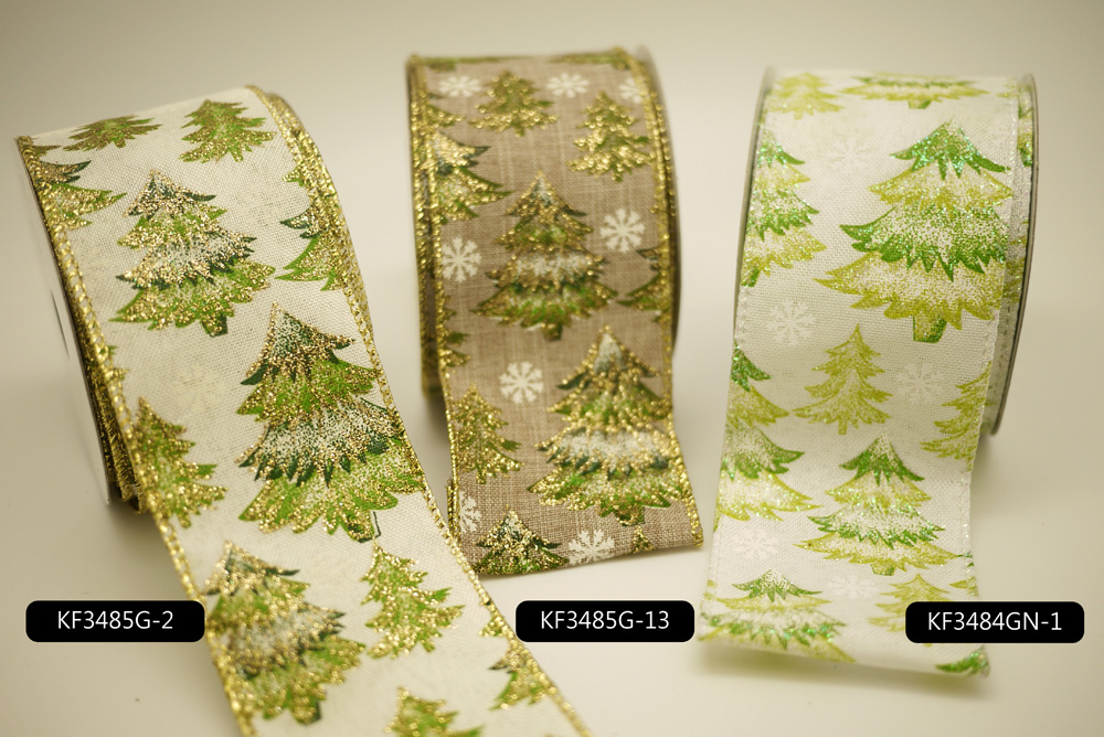 Do konturu choinek na kremowej i naturalnej sztucznej jucie użyto szczypty złotego brokatu. Brzeg wstążki jest przycięty i zszyty metaliczną nicią w pasującym kolorze, a wewnątrz znajduje się drut, który można łatwo wygiąć i ukształtować.