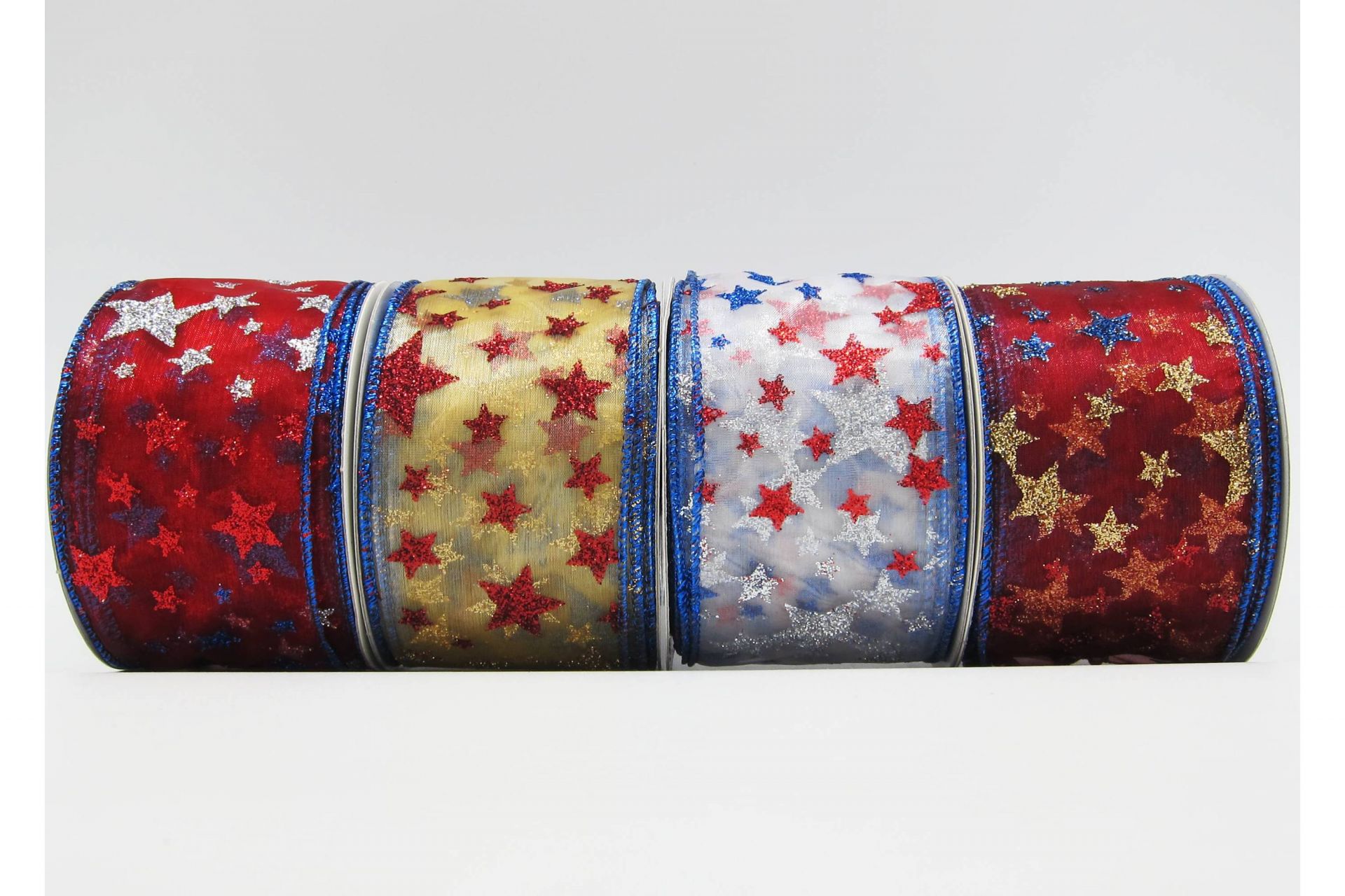 تتميز سلسلة شرائط الرابع من يوليو بنجوم كبيرة مطبوعة بنمط علم الولايات المتحدة ونجوم صغيرة بألوان ثابتة من الأحمر والأزرق الداكن والأبيض. يأتي في 3 ألوان من القماش المزيف المشبع باللون بما في ذلك الأبيض والطبيعي والكاكي الداكن. هذا الشريط الأمريكي المزين بنجوم الخماسيات متاح بشكل خاص بعرض 2-1/2 بوصة. تتميز هذه الشرائط أيضًا بحواف مسلكية مكتملة بخيط غير لامع مطابق للون الشريط للمساعدة في الحفاظ على شكل الشريط والقوس. إنها خيار مثالي لزينة يوم الاستقلال.