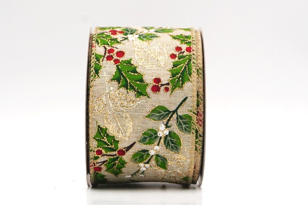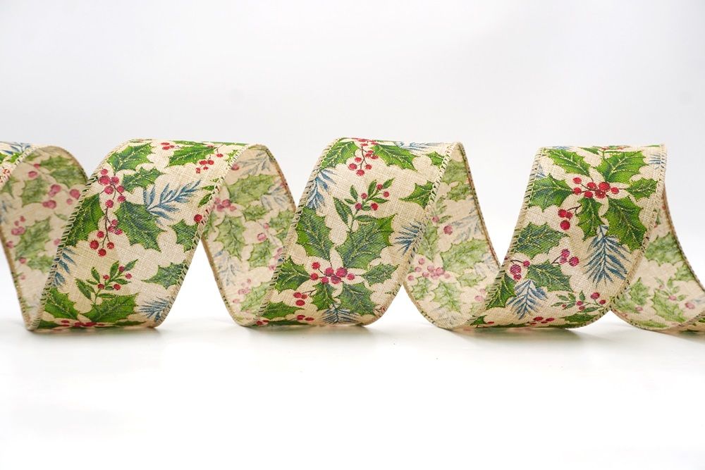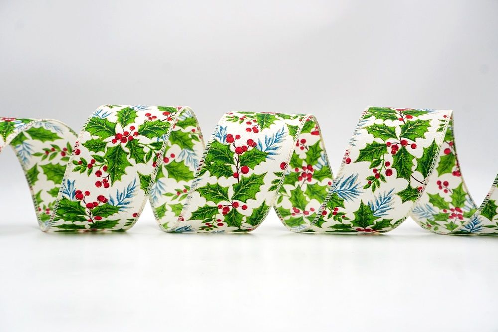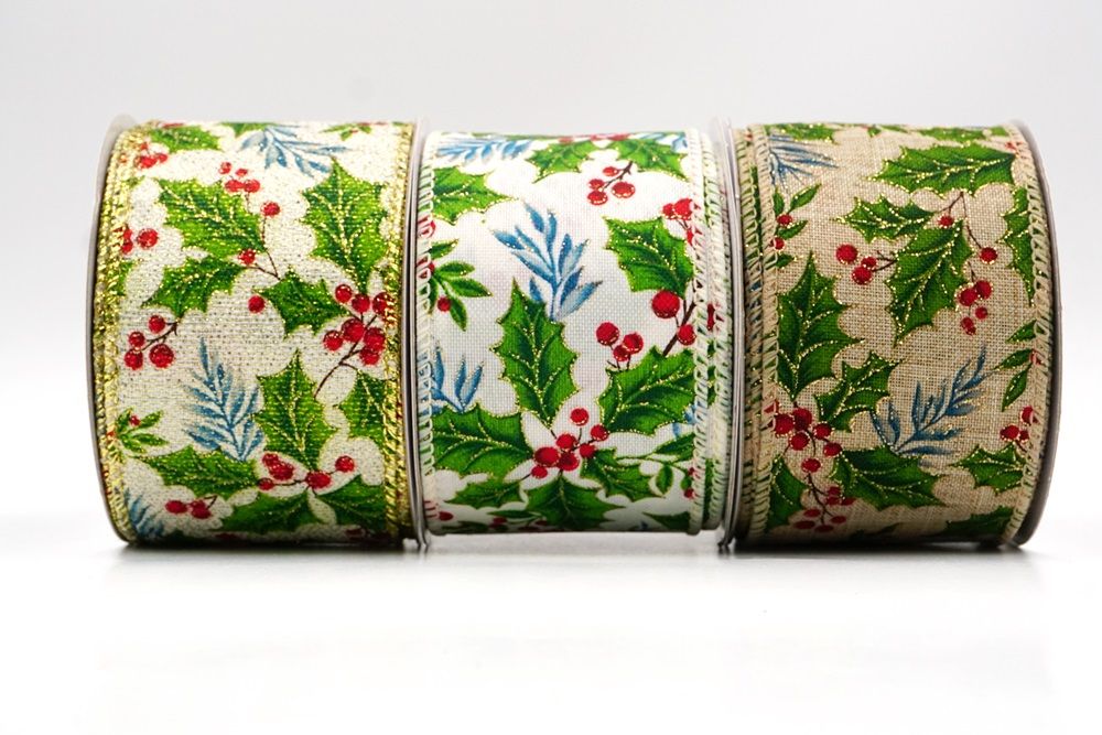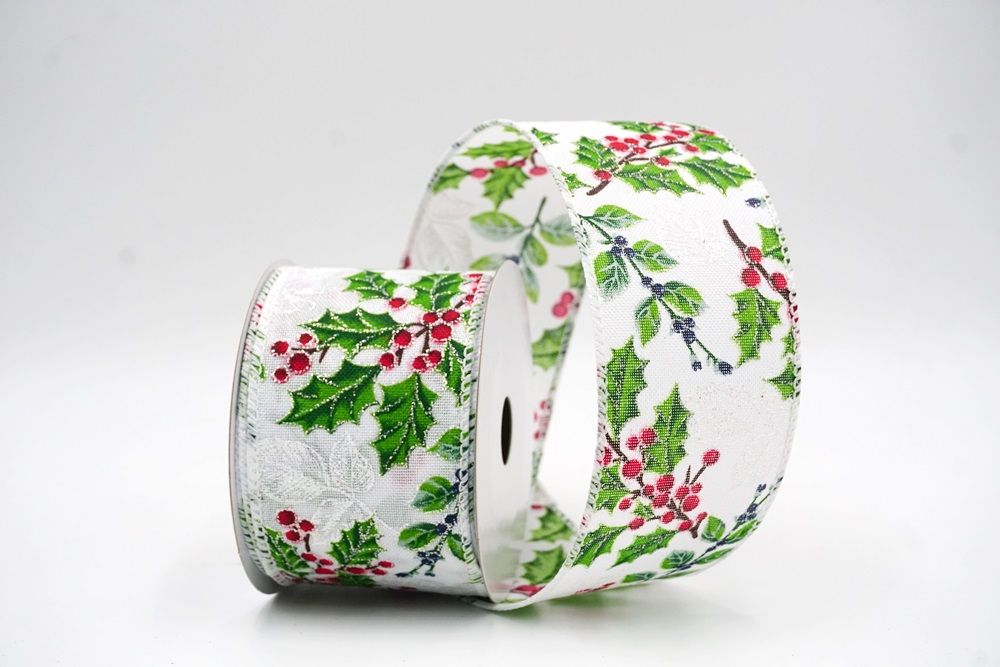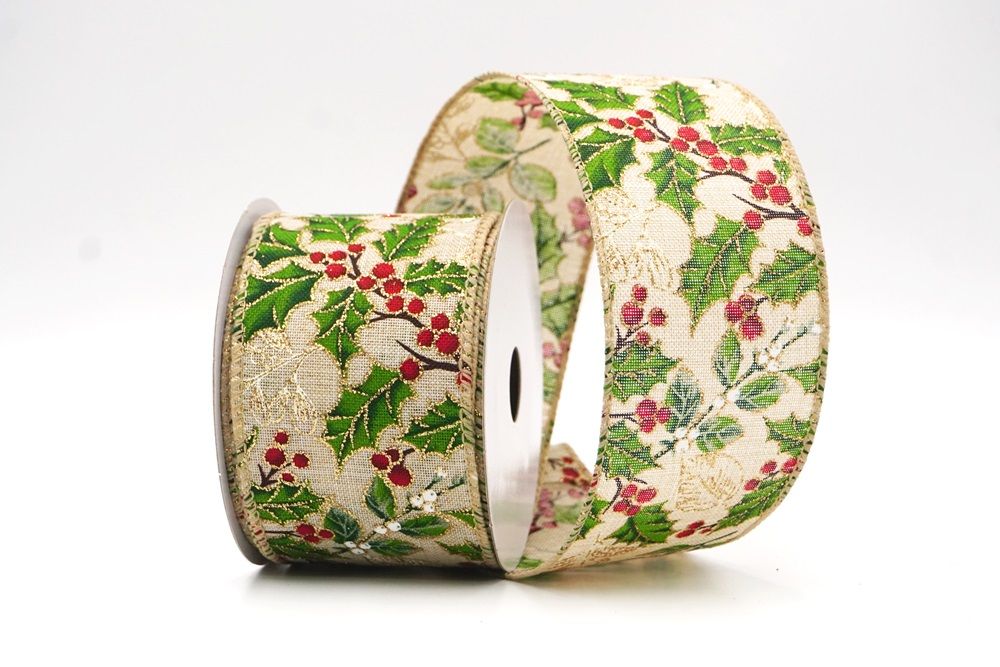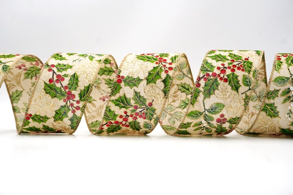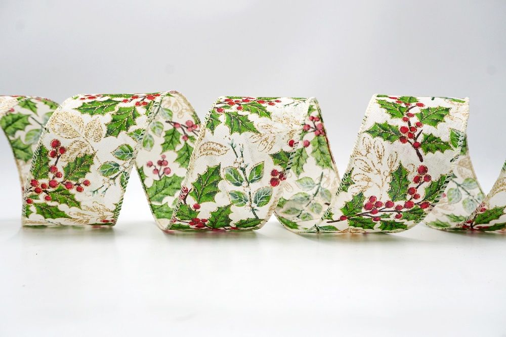 Gestaltet in reichen Feiertagsfarben, kommt dieses Band in weißen, hellbraunen und cremeweißen Grundtönen, die mit tiefgrünen Stechpalmenblättern und leuchtend roten Beeren verziert sind. Das filigrane Design bringt Wärme und Tradition und macht es ideal für sowohl rustikale als auch klassische Feiertagsdekorationsthemen.