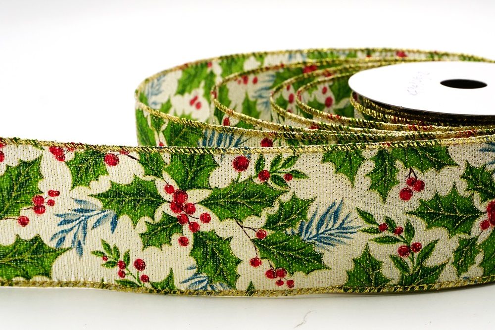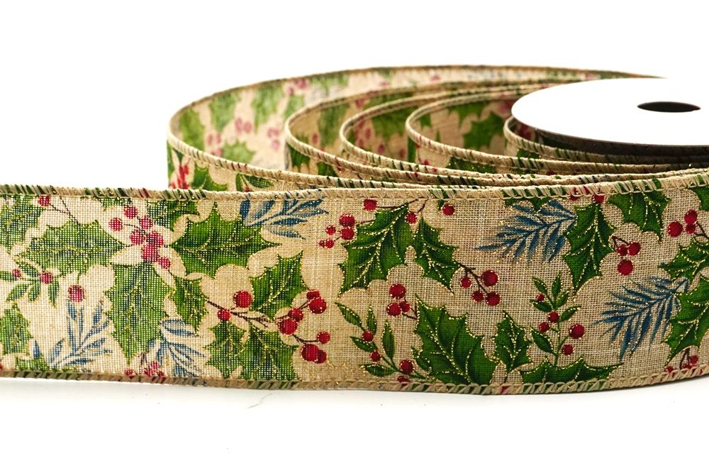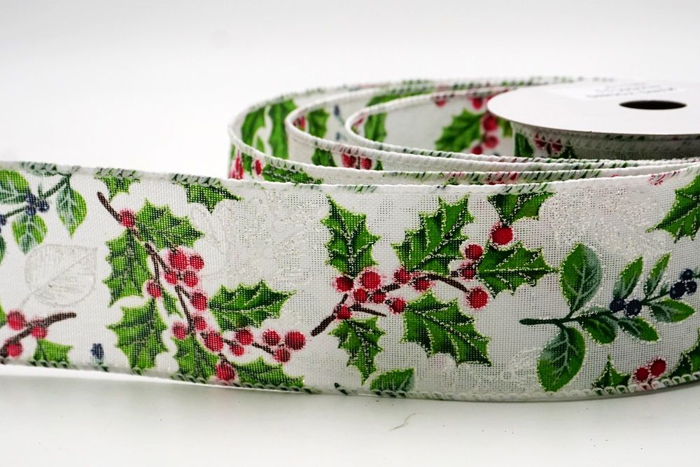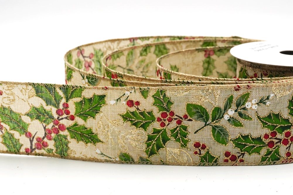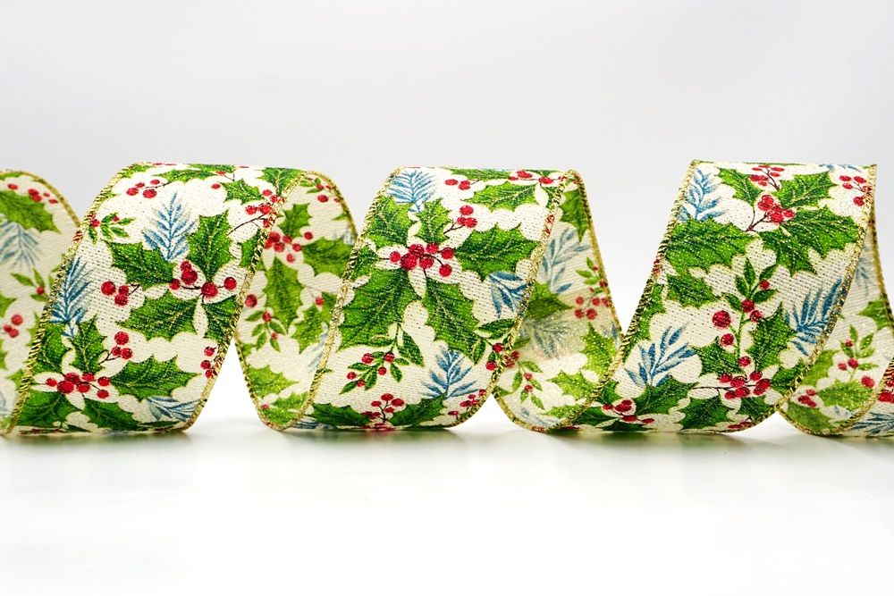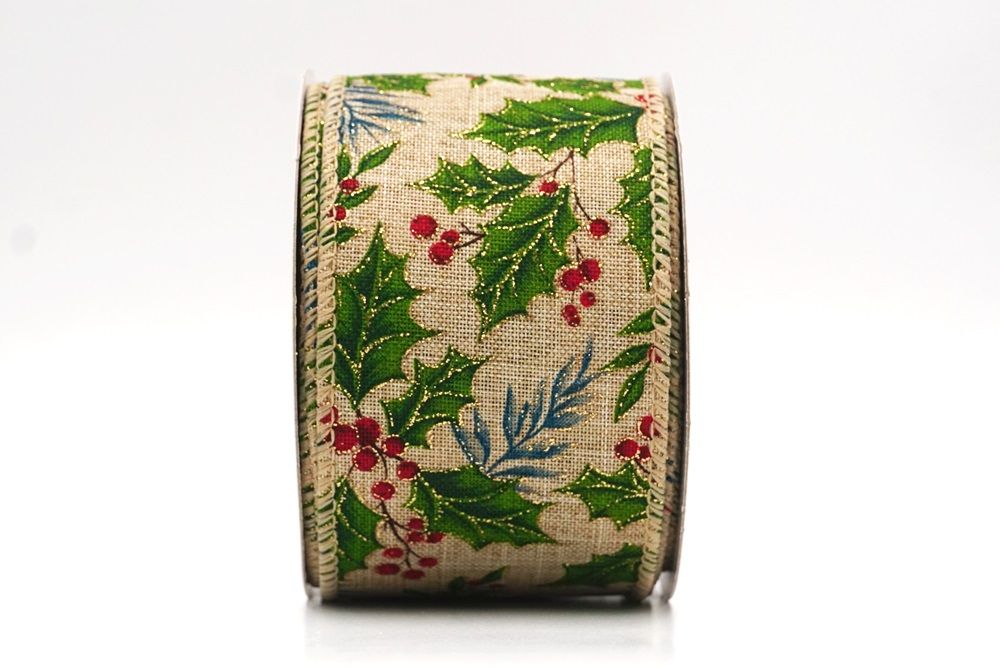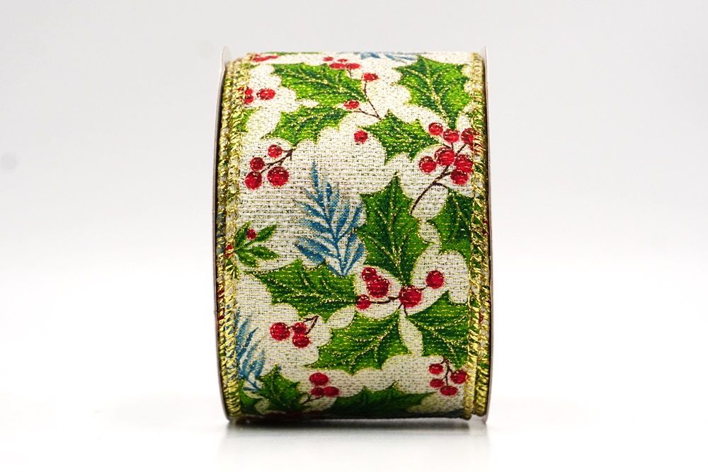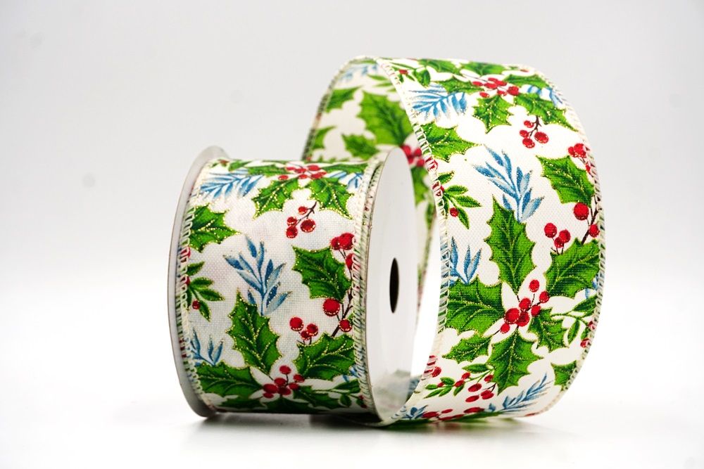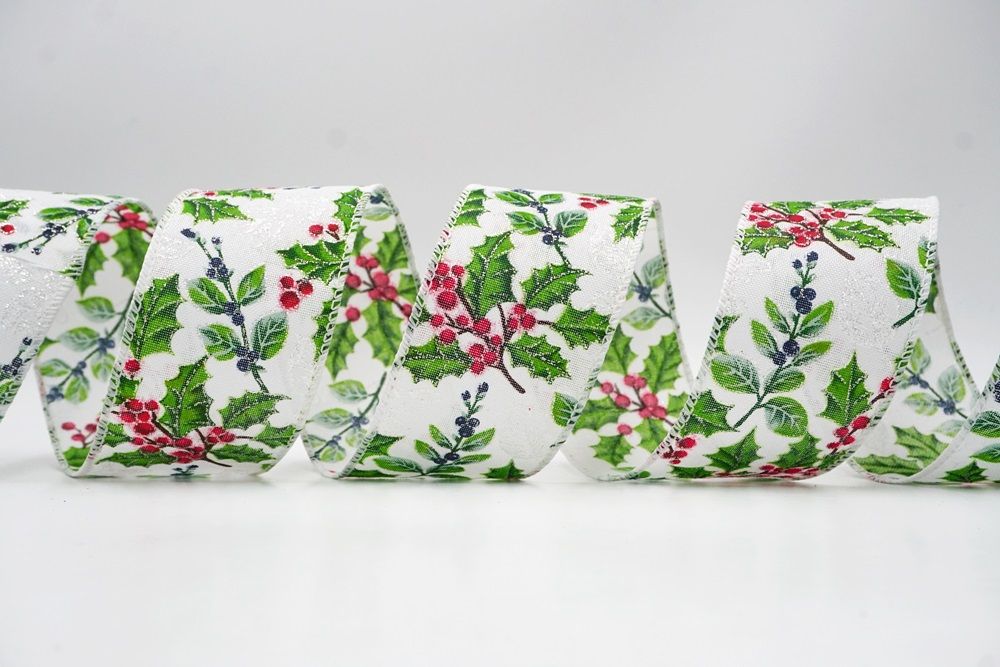 Gestaltet in reichen Feiertagsfarben, kommt dieses Band in weißen, hellbraunen und cremeweißen Grundtönen, die mit tiefgrünen Stechpalmenblättern und leuchtend roten Beeren verziert sind. Das filigrane Design bringt Wärme und Tradition und macht es ideal für sowohl rustikale als auch klassische Feiertagsdekorationsthemen.