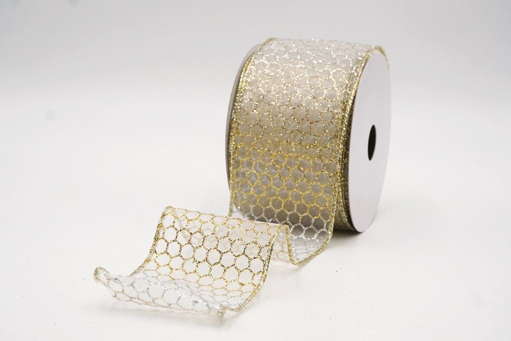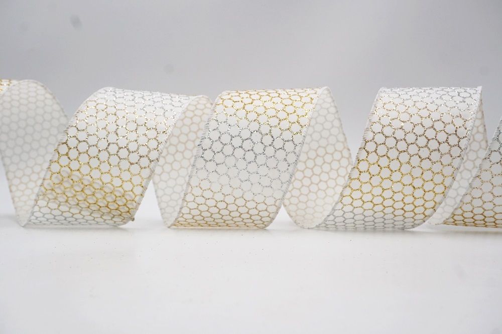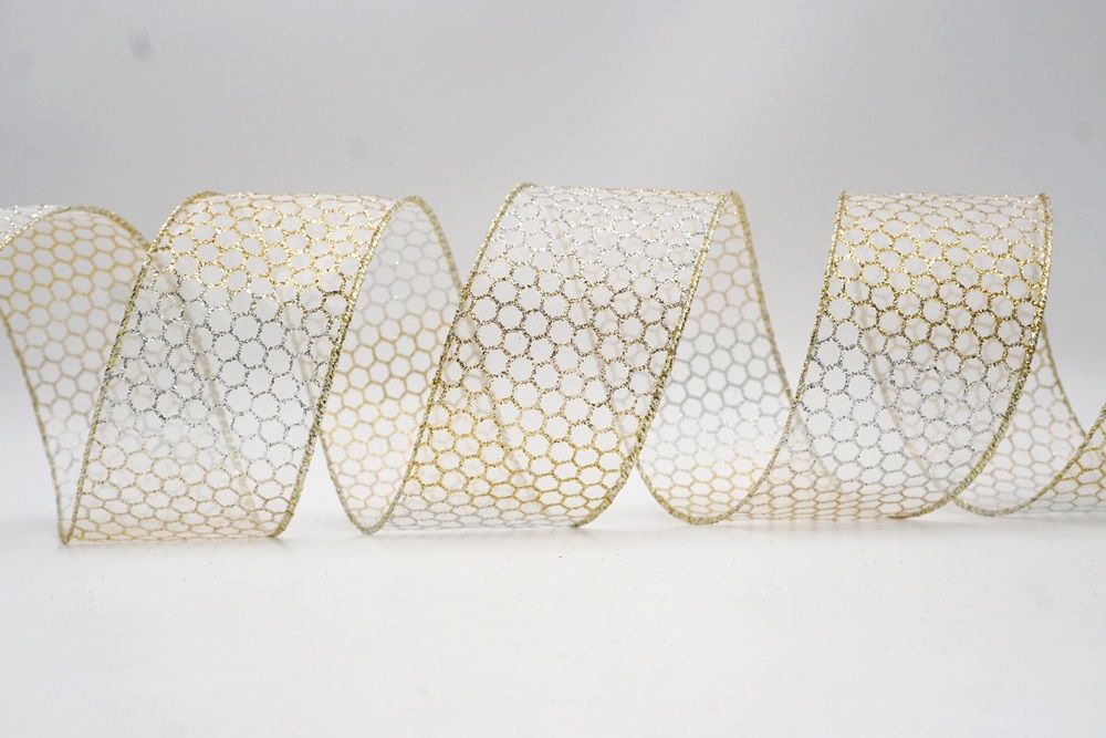 Geschmückt mit schimmernden Ornamentdesigns bringt dieses durchsichtige Band sofort Freude in die saisonale Dekoration. Wählen Sie aus einer breiten Palette von Farben, darunter Weiß, Weiß-Silber, Blau-Silber, Hellbraun-Gold, Weiß-Gold, Grün, Marineblau, Violett, Pink, Königsblau und Rot.
