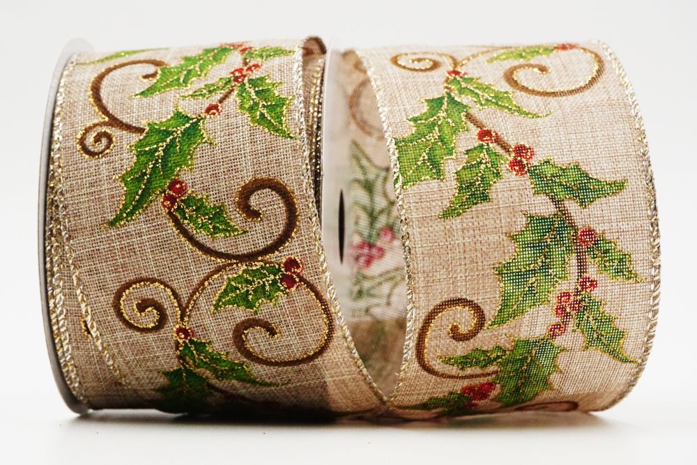 Die Hauptelemente dieses Designs sind Stechpalmenblätter mit Beeren und Weinreben. Das Band ist in allen Größen erhältlich. Es gibt zwei Stoffoptionen, darunter Kunstburlap, das zu 100 % aus Polyester besteht, und gewebtes Gitter, das zu 85 % aus Polyester und zu 15 % aus Metall besteht. Alle haben merrow-verdrahtete Kanten in verschiedenen Farben und Materialien, um die Farbe jedes Stoffes widerzuspiegeln.