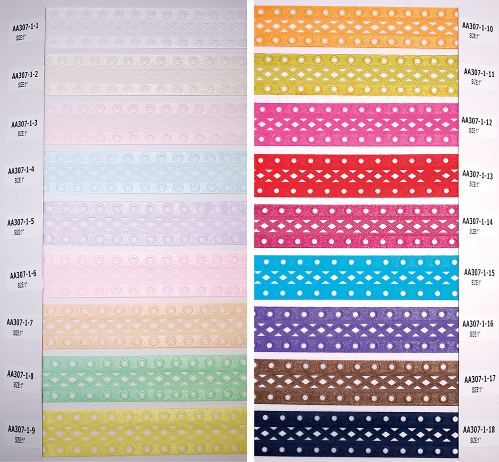 Κορδέλα σατέν 1 ίντσας με γεωμετρικά ανοίγματα στο κέντρο και τρύπες με κουκίδες στις πλευρές. Αυτή η κορδέλα είναι ακατέργαστη, έτσι ώστε να είναι εύκολη στη χρήση. Έρχεται σε όλα τα χρώματα. Μπορούμε επίσης να φτιάξουμε προσαρμοσμένα χρώματα ή χρώματα Pantone. Ιδανική για χειροτεχνίες, συσκευασία δώρων και πολλά άλλα.