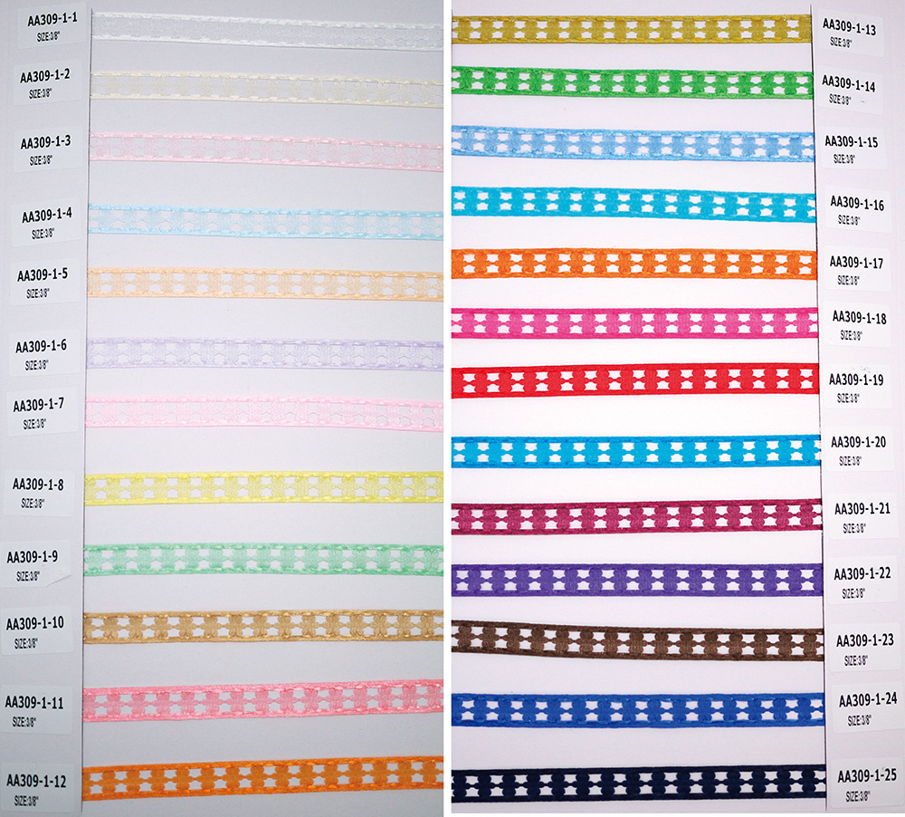 Αυτή η σειρά είναι μια χαριτωμένη κορδέλα πλευρικής ραφής 3/8 ιντσών με διάτρητα λουλούδια. Είναι αναστρέψιμη και διατίθεται σε όλα τα χρώματα. Μπορούμε επίσης να ταιριάξουμε τα προσαρμοσμένα χρώματά σας ή τα χρώματα Pantone. Αυτή η κορδέλα είναι