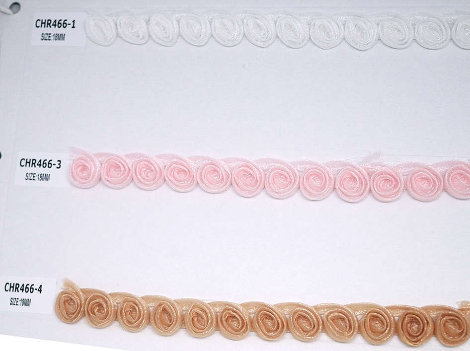 A gorgeous 18mm trimming that has organza fabric sewn like delicate roses. It is very elegant and great for sewing to clothing as a trimming or for your craft projects, home décor, and more. Quality assured. Color cards or samples are available upon request.