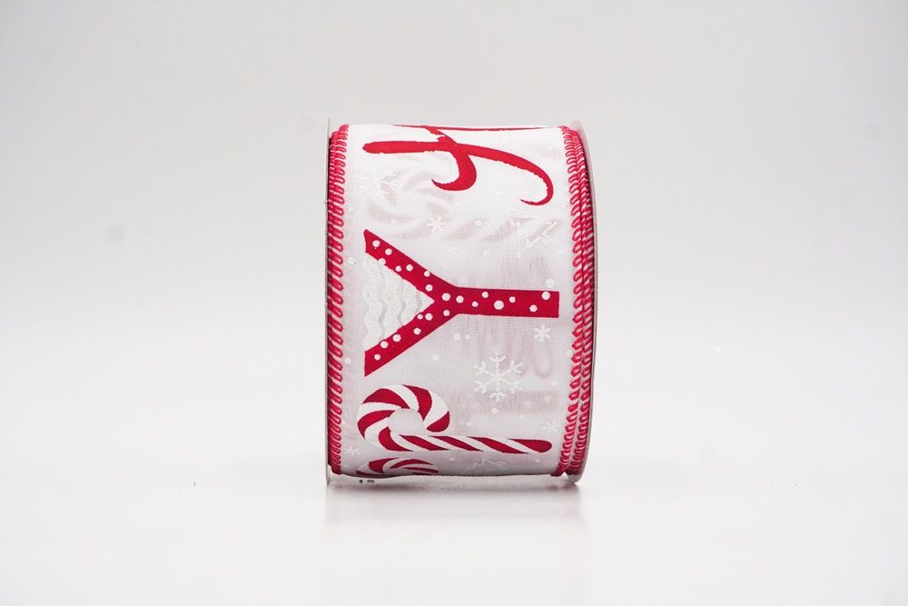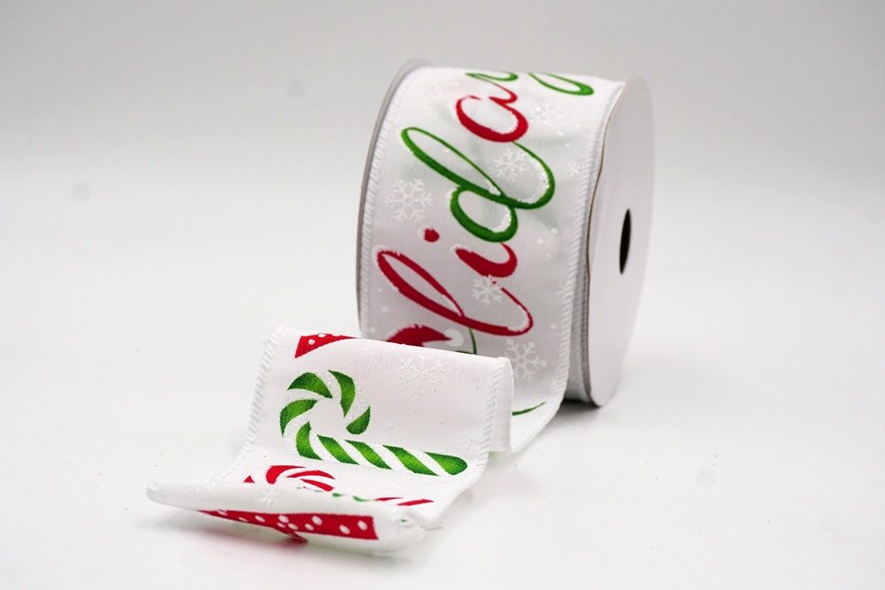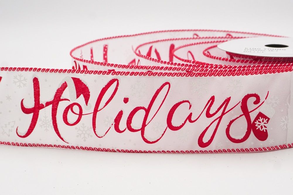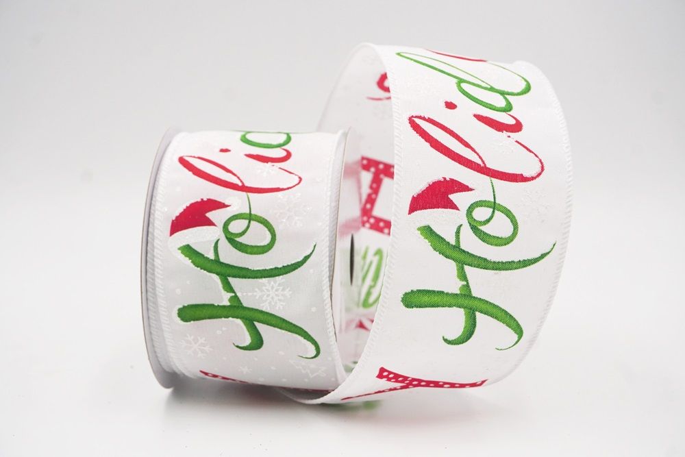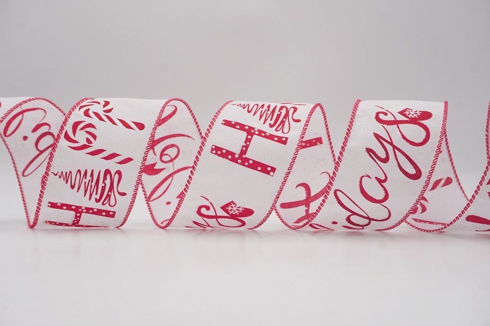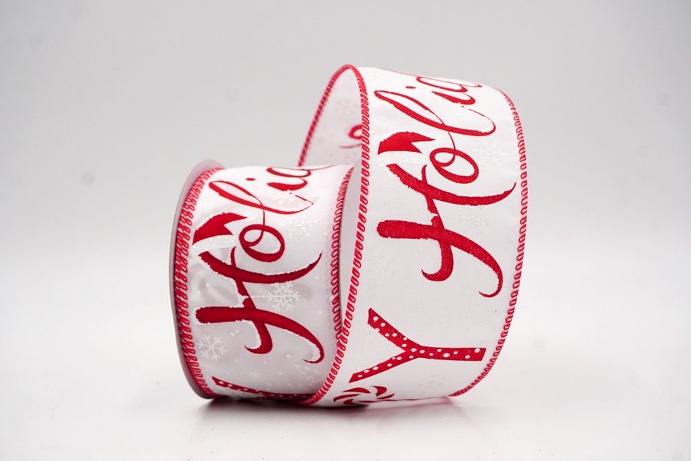 Available in white and white-red, the design is printed on metallic burlap and plain weave fabrics for a polished look. Widths range from 1 1/2 inch to 2 1/2 inch (38 mm–68 mm), offering flexibility for wreaths, gifts, and decorative accents.