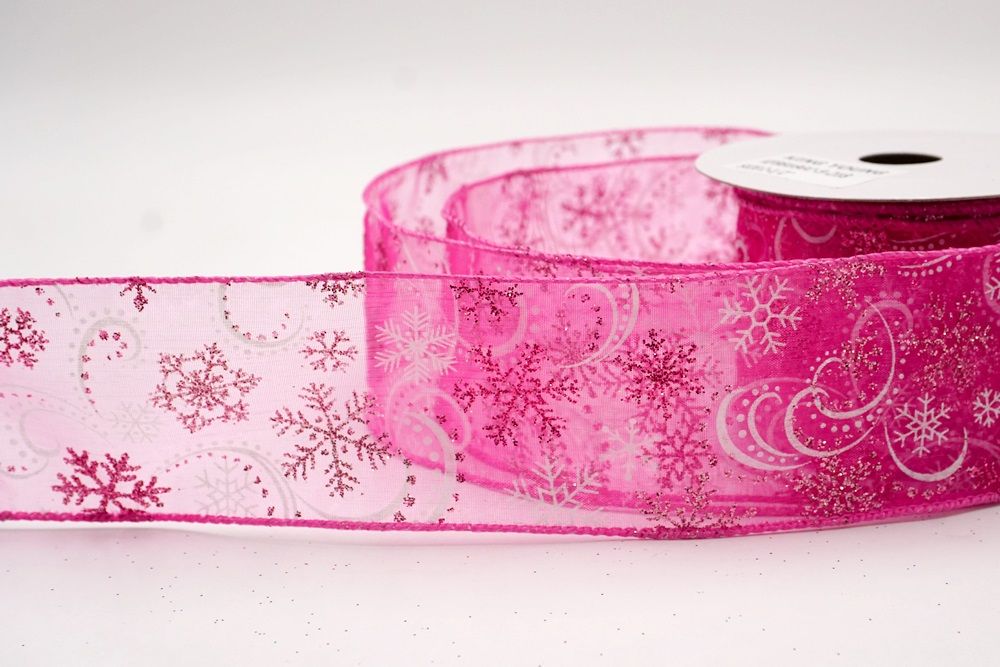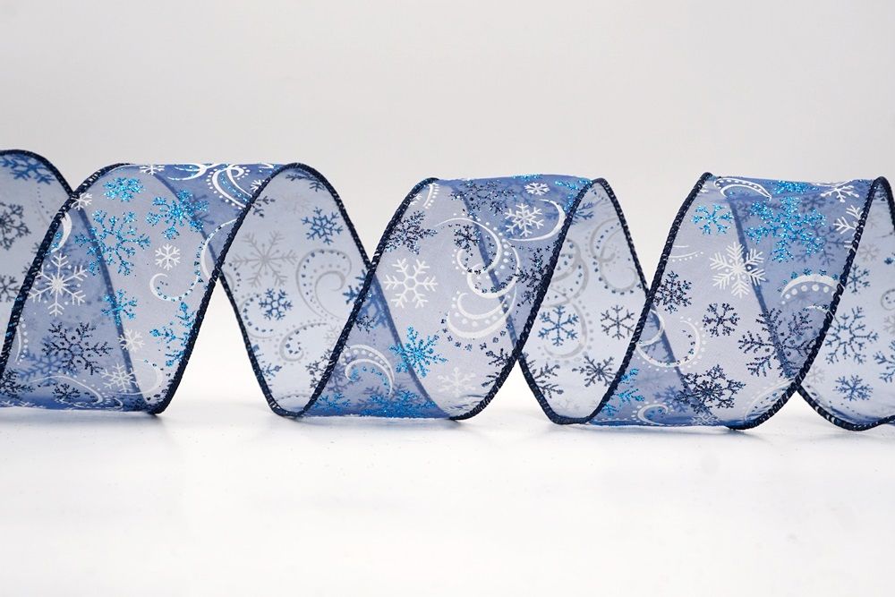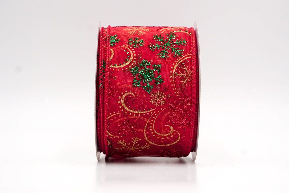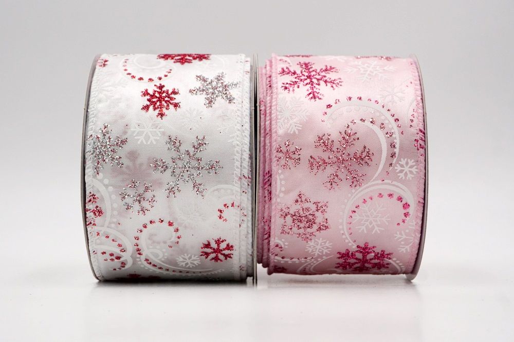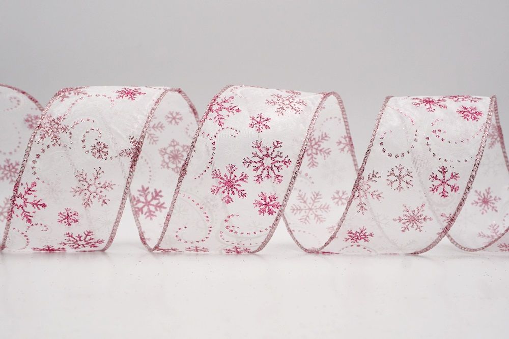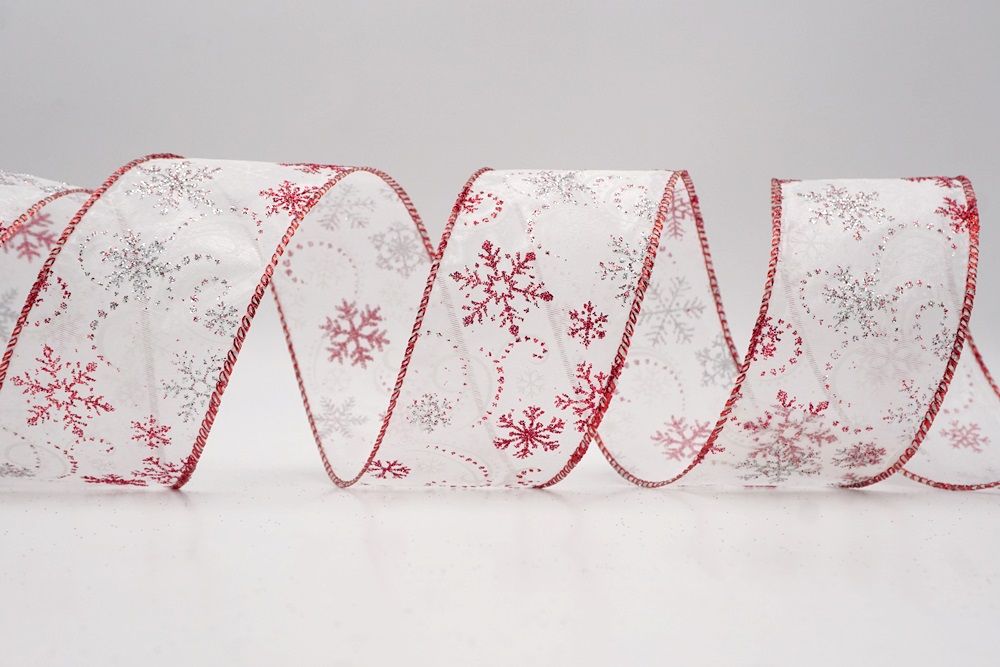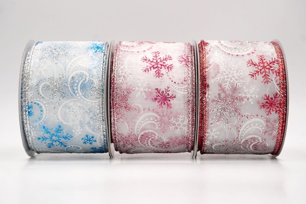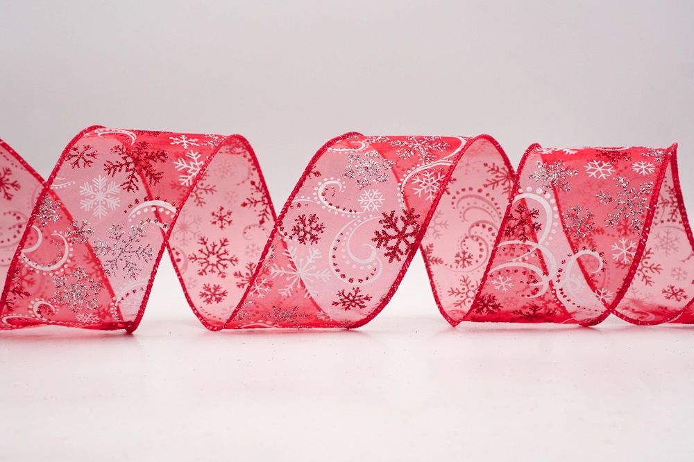 Add a touch of winter magic to your seasonal celebrations with the Glitter Snowflake & Swirl Wired Ribbon. This collection is designed to capture the mesmerizing beauty of a flurry on a crisp December night. The pattern features intricate, crystallized snowflakes caught in a dance of glittering wind swirls, creating a sense of movement and elegance. You can choose between two distinct fabric styles to match your theme: a translucent, airy sheer fabric available in stunning shades of Gold, Red, Navy Blue, Hot Pink, and White, or a solid, crisp plain weave in White that makes the colorful glitter designs pop. The sheer options are particularly enchanting as they allow light to pass through, making the glitter shimmer intensely like ice crystals, while the solid white fabric offers a classic, snow-covered look perfect for a traditional White Christmas theme.
