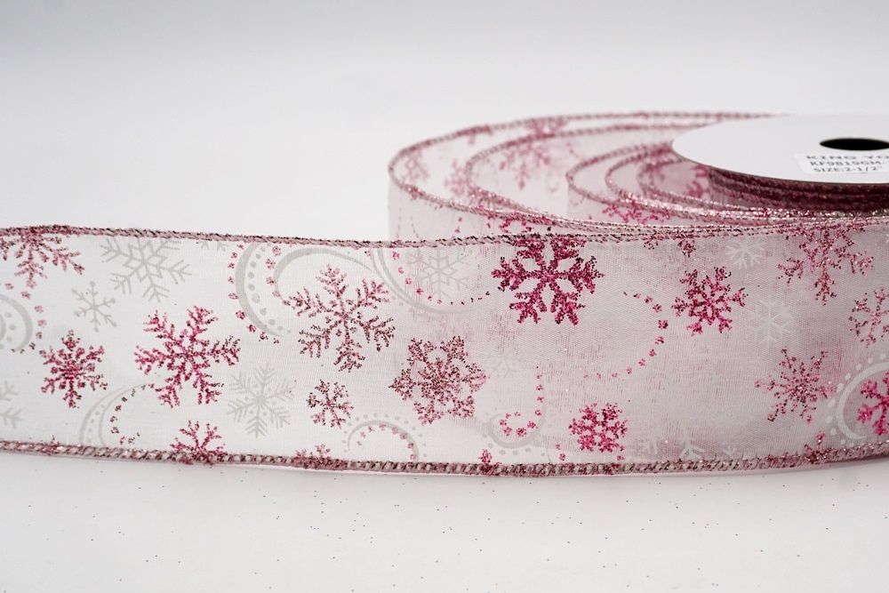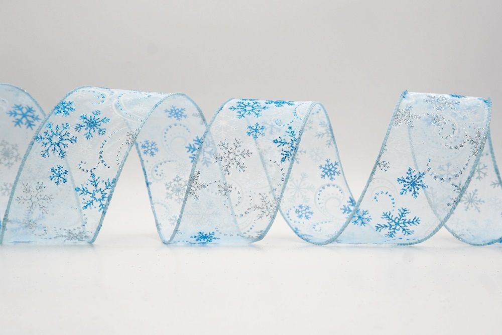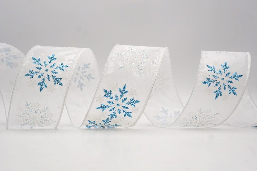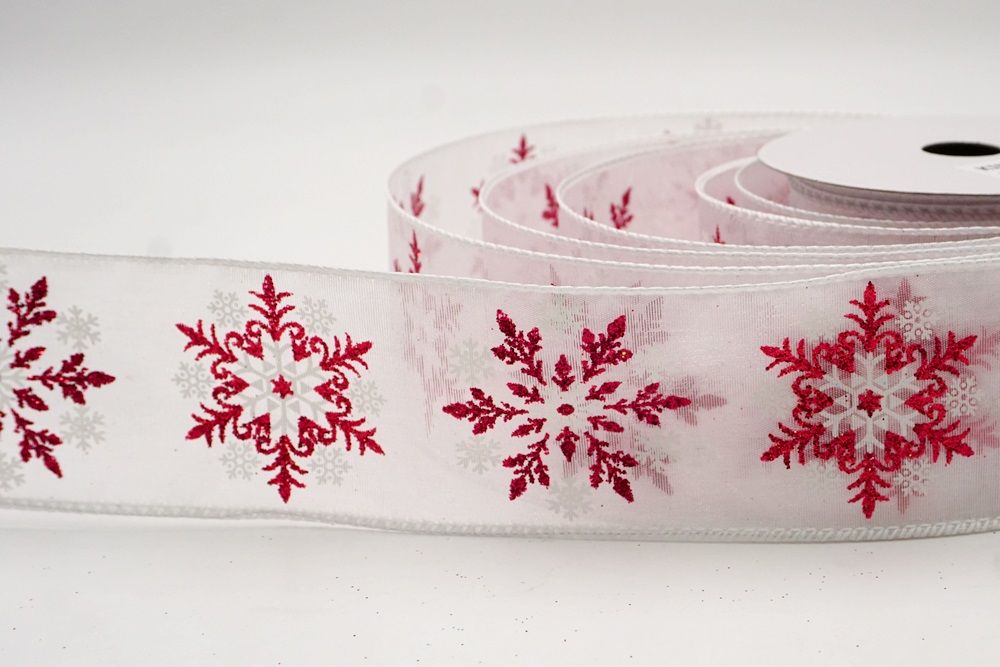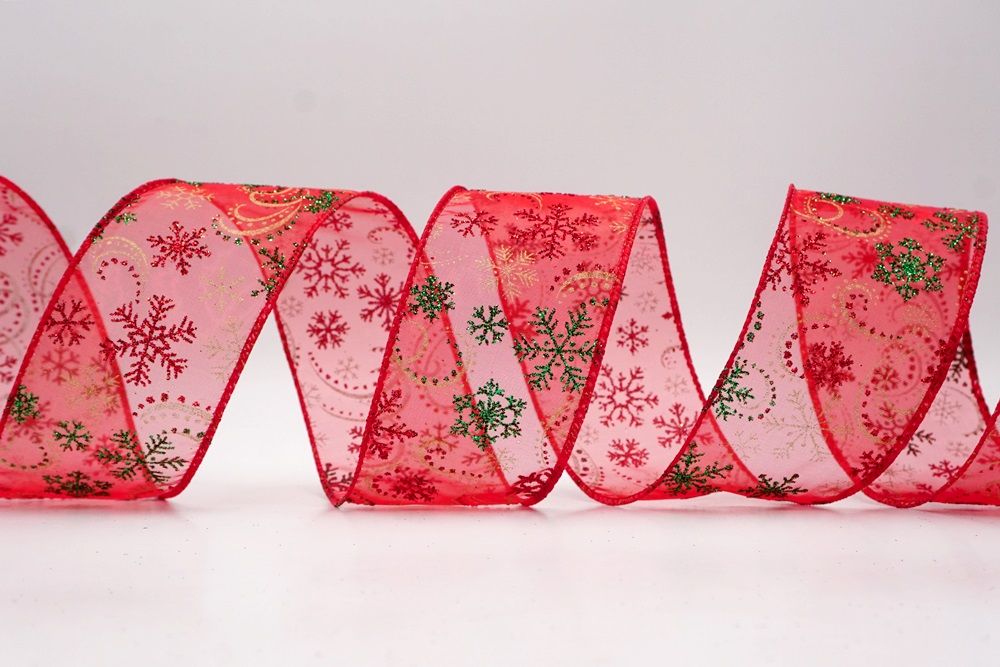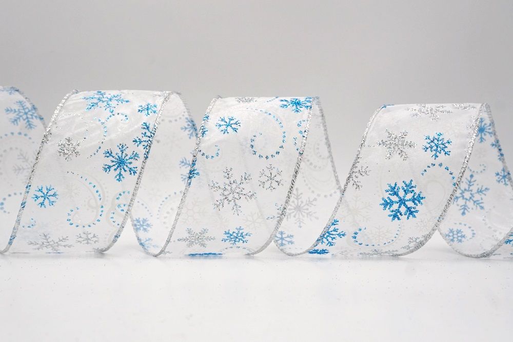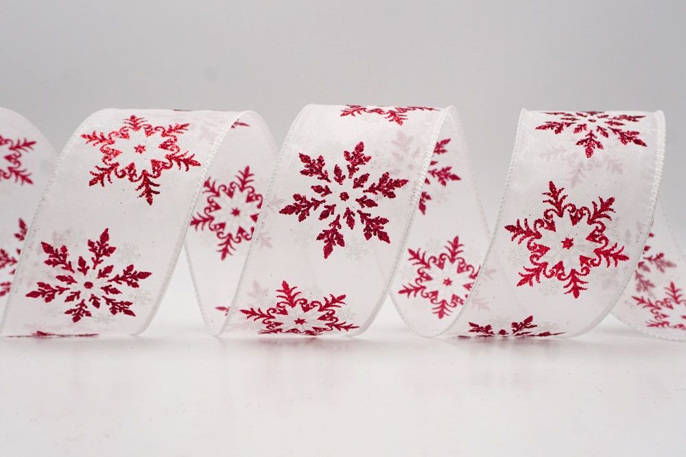 Add a touch of winter magic to your seasonal celebrations with the Glitter Snowflake & Swirl Wired Ribbon. This collection is designed to capture the mesmerizing beauty of a flurry on a crisp December night. The pattern features intricate, crystallized snowflakes caught in a dance of glittering wind swirls, creating a sense of movement and elegance. You can choose between two distinct fabric styles to match your theme: a translucent, airy sheer fabric available in stunning shades of Gold, Red, Navy Blue, Hot Pink, and White, or a solid, crisp plain weave in White that makes the colorful glitter designs pop. The sheer options are particularly enchanting as they allow light to pass through, making the glitter shimmer intensely like ice crystals, while the solid white fabric offers a classic, snow-covered look perfect for a traditional White Christmas theme.
