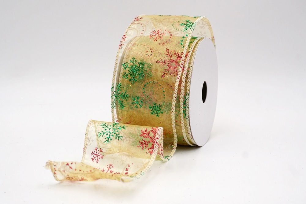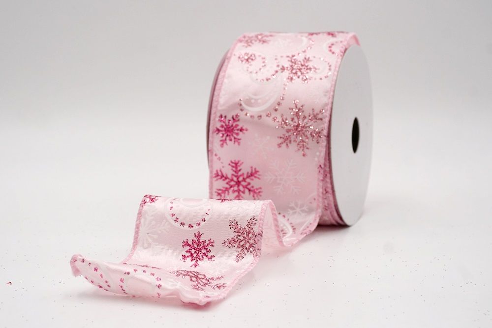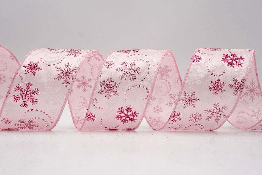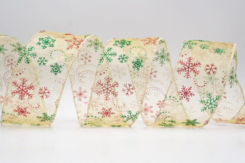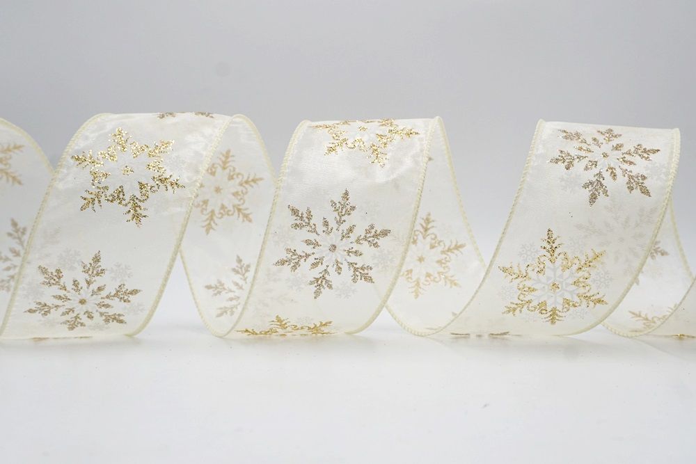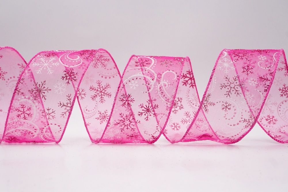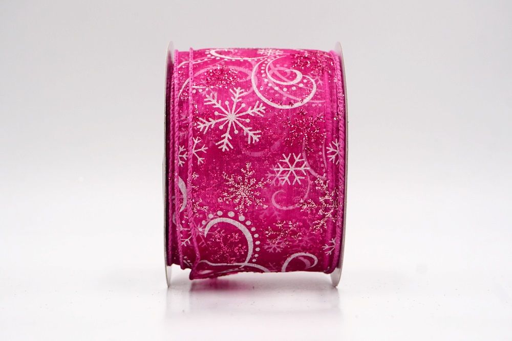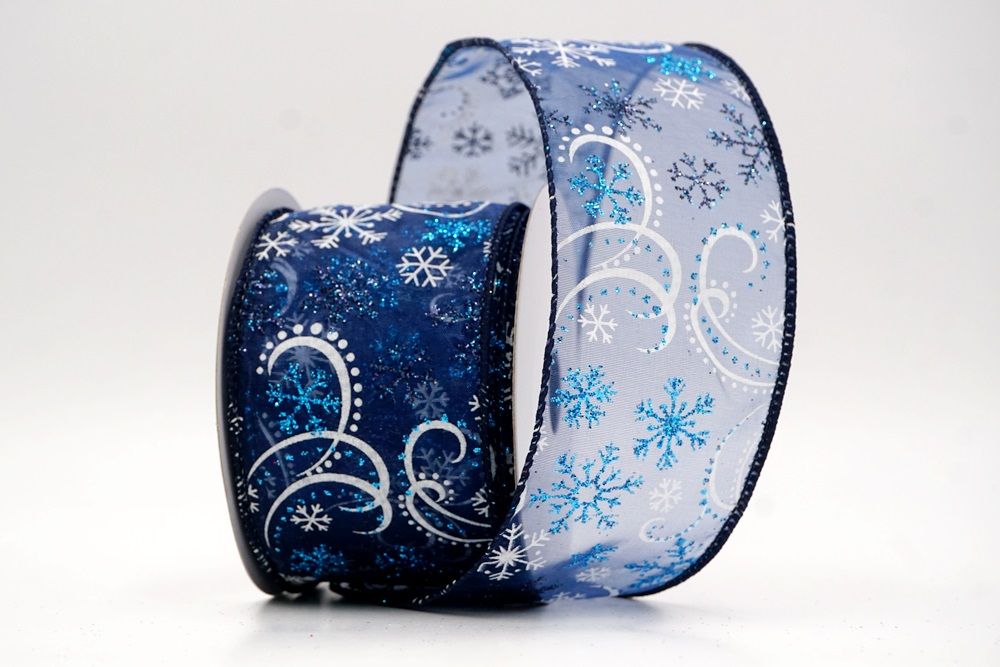Add a touch of winter magic to your seasonal celebrations with the Glitter Snowflake & Swirl Wired Ribbon. This collection is designed to capture the mesmerizing beauty of a flurry on a crisp December night. The pattern features intricate, crystallized snowflakes caught in a dance of glittering wind swirls, creating a sense of movement and elegance. You can choose between two distinct fabric styles to match your theme: a translucent, airy sheer fabric available in stunning shades of Gold, Red, Navy Blue, Hot Pink, and White, or a solid, crisp plain weave in White that makes the colorful glitter designs pop. The sheer options are particularly enchanting as they allow light to pass through, making the glitter shimmer intensely like ice crystals, while the solid white fabric offers a classic, snow-covered look perfect for a traditional White Christmas theme.