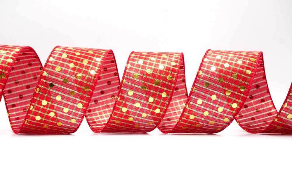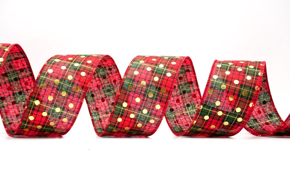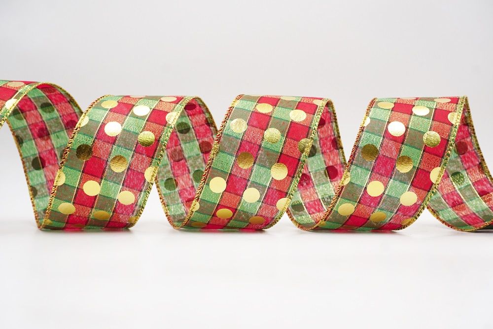 Add cheerful sparkle to your festive designs with the Gold Polka Dots Holiday Wired Ribbon