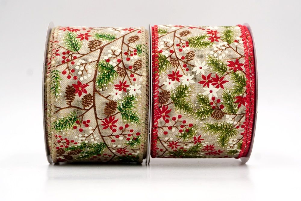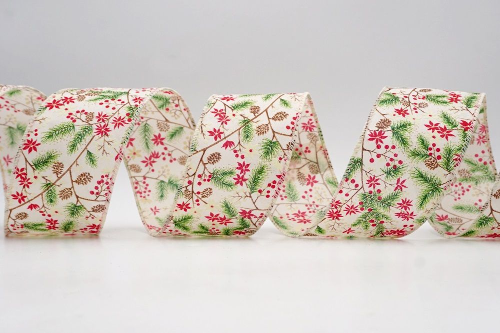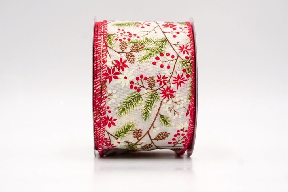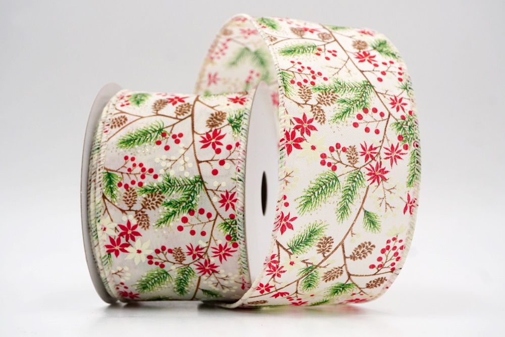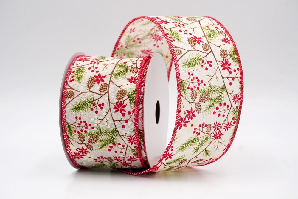 The design of this ribbon truly celebrates the classic elements of a winter wonderland, making it absolutely perfect for Christmas. It features an enchanting pattern of evergreen pine branches, often dusted with a hint of white like fresh snow, intertwined with clusters of bright red and white winter berries. You'll also spot charming pinecones scattered throughout, adding to the natural forest feel. In some designs, delicate poinsettia-like flowers may also be present, enhancing the festive look. This ribbon is ideal for creating stunning holiday wreaths that capture the essence of a snowy forest, or for weaving through your Christmas tree to add a touch of rustic elegance and vibrant color. It's also fantastic for embellishing garlands, tying around gifts for a beautifully natural presentation, or adding a cozy, traditional feel to any part of your seasonal decor. The Holiday Pine & Winter Berry Wired Ribbon perfectly combines the beauty of nature with the joy of Christmas, creating a truly inviting and festive atmosphere.