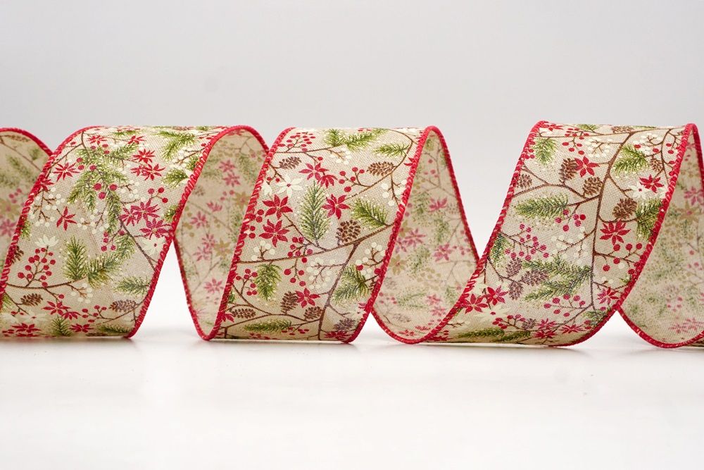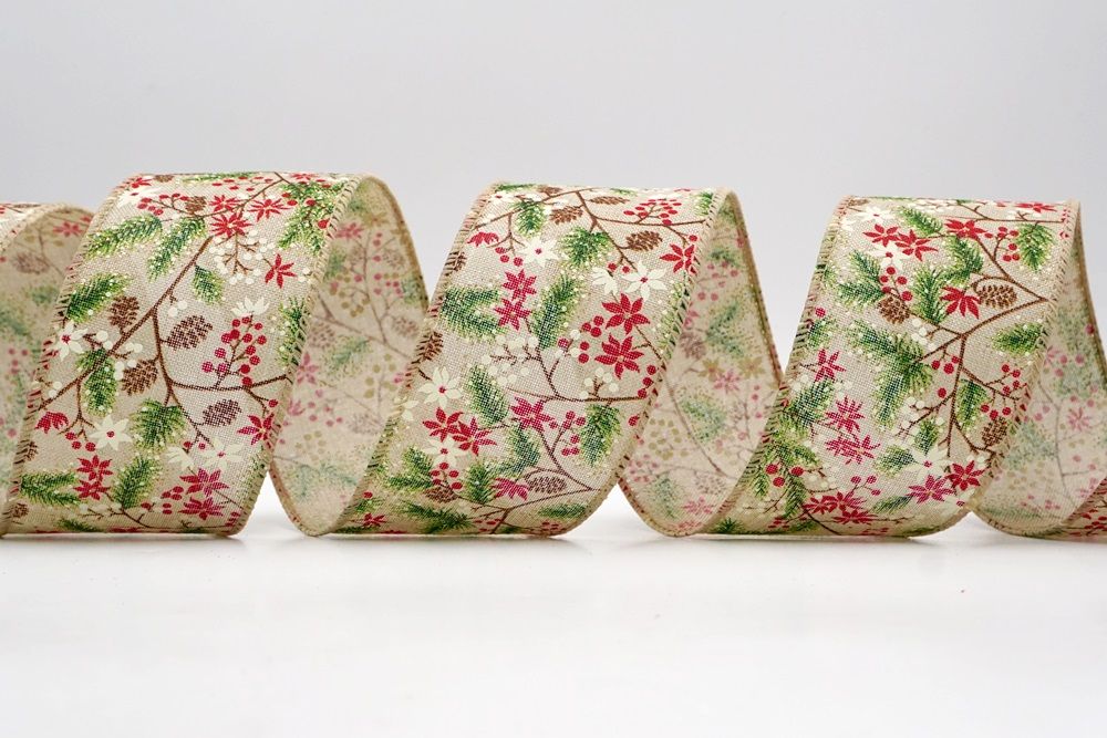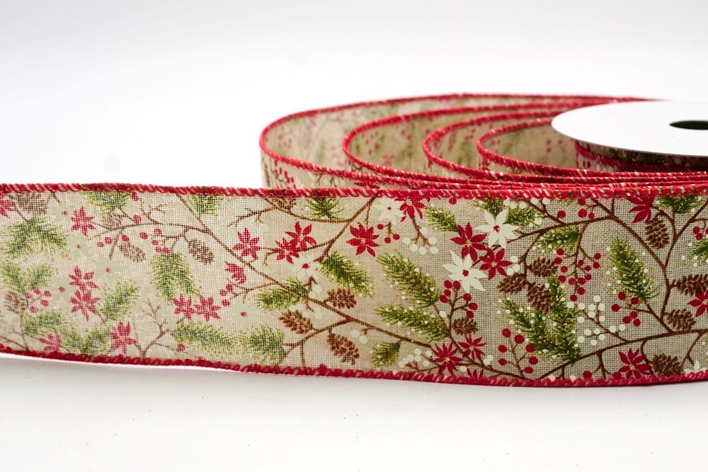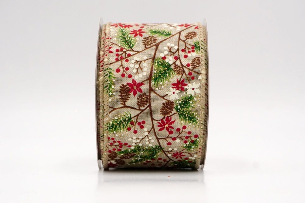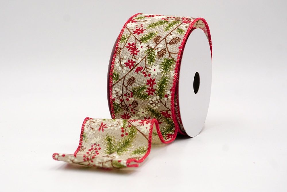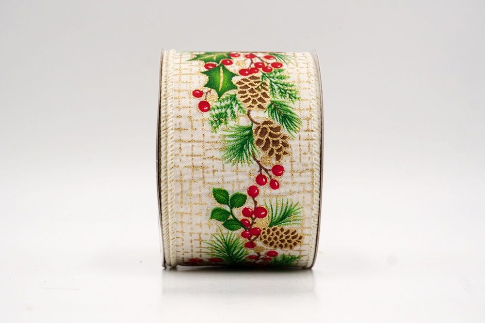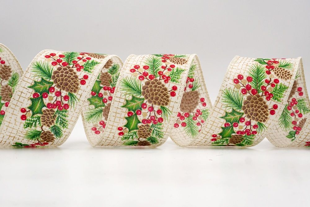 Adorn your home with the natural beauty of the Holiday Pine & Winter Berry Wired Ribbon, a perfect choice for bringing rustic charm to your festive decorations. This lovely ribbon is crafted from high-quality faux burlap, giving it a wonderfully textured and earthy feel that instantly evokes a cozy, traditional Christmas. It's available in two inviting colors: a soft cream and a warm khaki, both providing an excellent backdrop for the vibrant holiday design. You can find this versatile ribbon in a range of sizes, from a subtle 1 inch to a more impactful 2.5 inches wide, and even larger options can be custom-ordered to perfectly suit your creative projects. A key feature that makes this ribbon a joy to work with is its wired edge. This allows you to easily shape and mold the ribbon, ensuring that your bows hold their beautiful form and your decorative accents stay exactly where you want them, making your crafting both simple and satisfying.