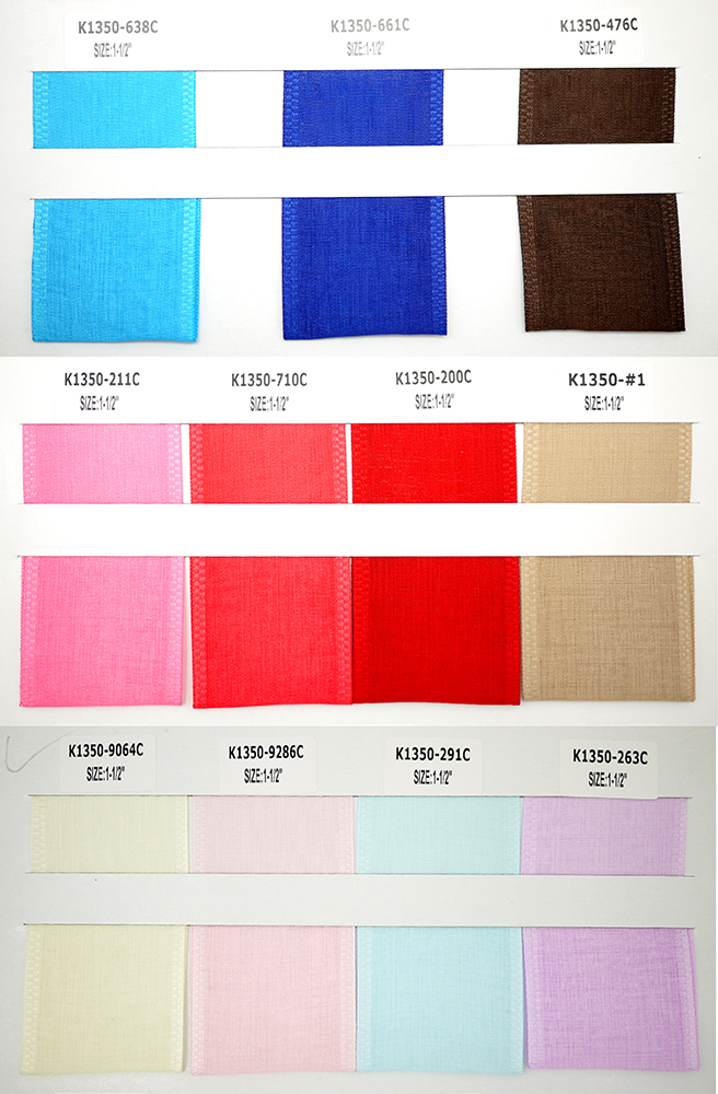 This series is a 1-1/2 inch fabric-like woven ribbon made from 100% polyester in solid colors. It is reversible and without wire in the edge. This ribbon has a matte look and flimsy feel. It currently comes in white, beige, lilac, light blue, toffee, light pink, hot pink, light yellow, peach, red, blue, navy and brown. Custom colors or pantone colors can be arranged per request. This ribbon is great for bows, craft projects, gift wrapping and more.