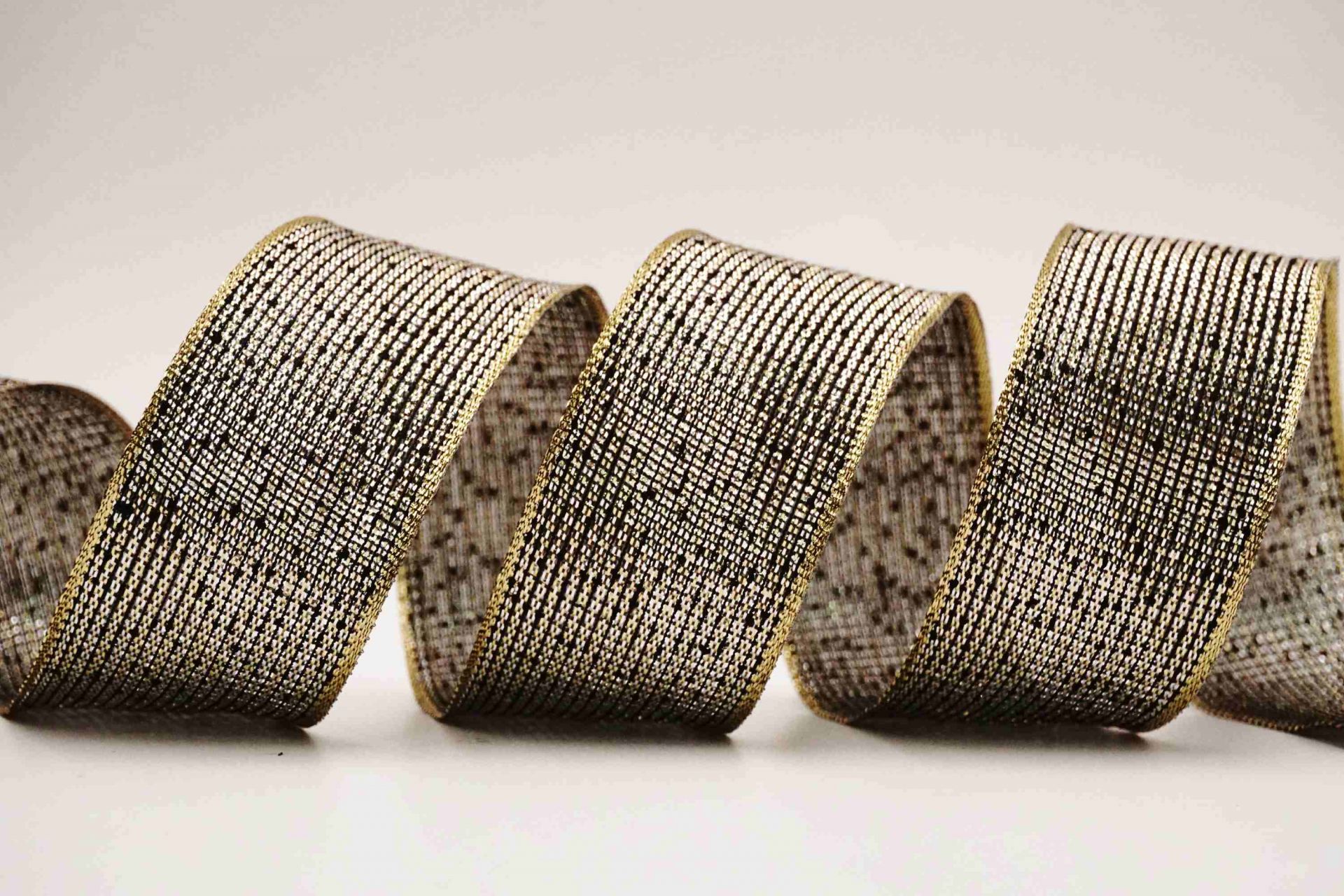 Bicolored metallic ribbon in 1-1/2 inch width that has an open weave and see-through effect. We use two different colors and textures of metallic yarn to weave this beautiful ribbon. The twisted yarn is randomly woven along the warp giving a fun look. Perfect for all decoration needs, wreath designs, craft projects and bows. Quality assured. Color cards are available upon request.