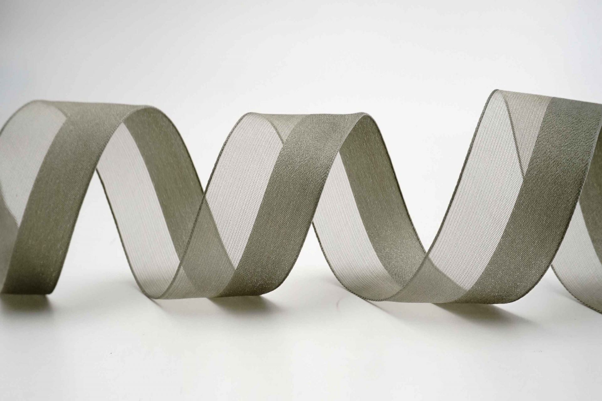 Different weaving techniques are used for this striped satin & sheer ribbon, so you’ll see 3 different textures in this ribbon. First, the ribbon base is fine polyester made organza, which comes with seven groundings. Second, there are two thick satin stripes woven along the center. Last but not least, the gray thin stripes are made from a special kind of yarn that has been under treatment. Therefore they become glossy.