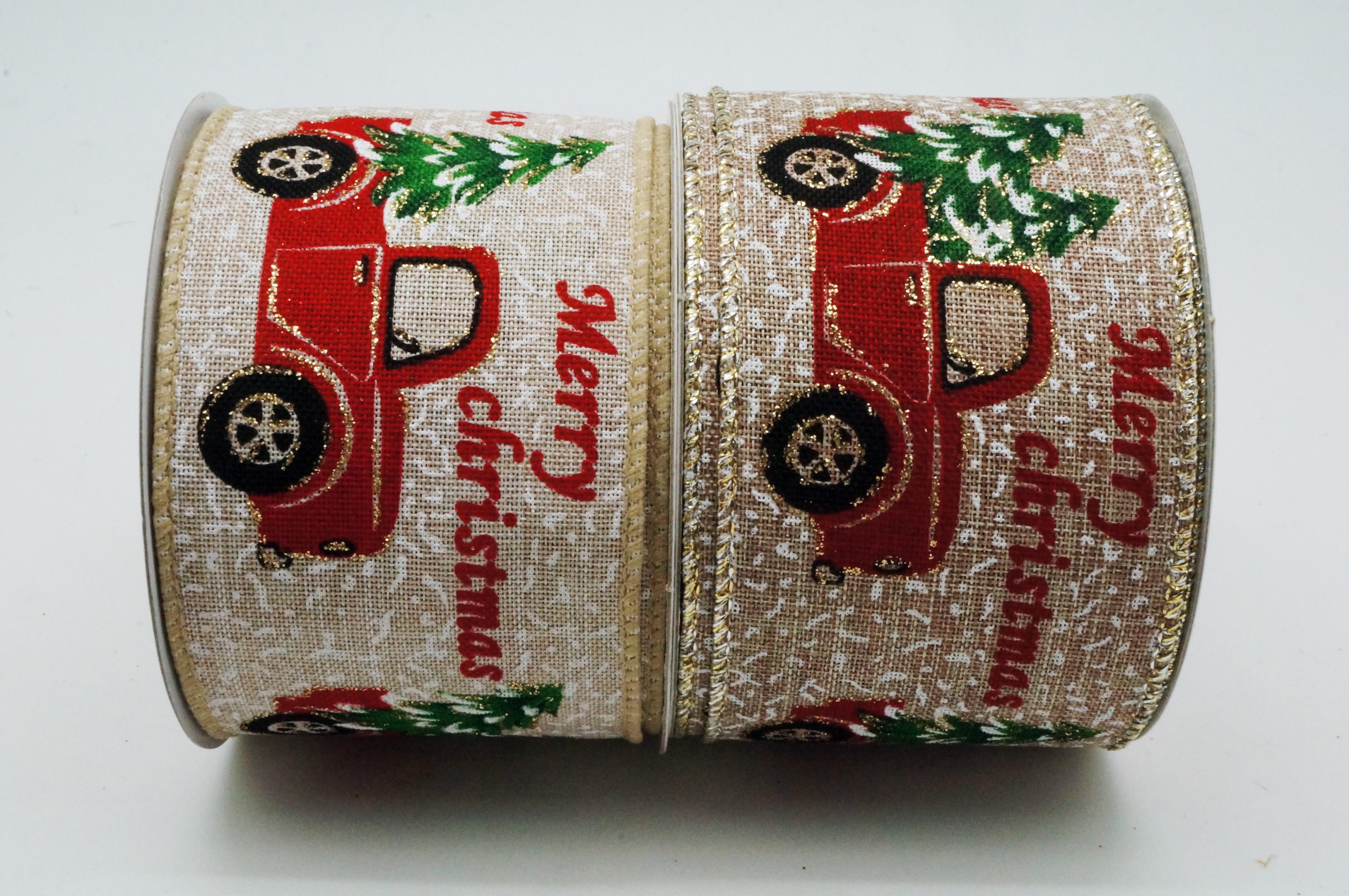 The red truck Christmas tree faux burlap ribbon has wired edges finished with a matte matching thread for the lighter shade and a mixed metallic gold & silver thread for the darker shade to help the ribbon maintain its shape. This ribbon is available in a specific 2-1/2 inch width and two ribbon colors.