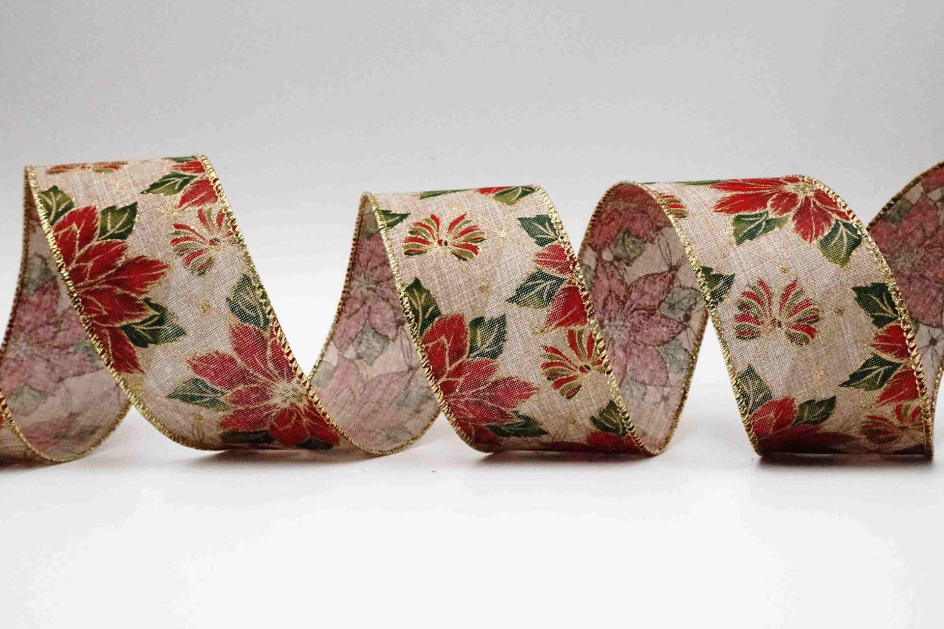 The ribbon presents the most beautiful scene that flowers are at their fullest. Petal-like leavezs are painted with red from light to dark and lined by a hint of gold. Red poinsettias are surrounded by fresh green leaves which help them stand out more.