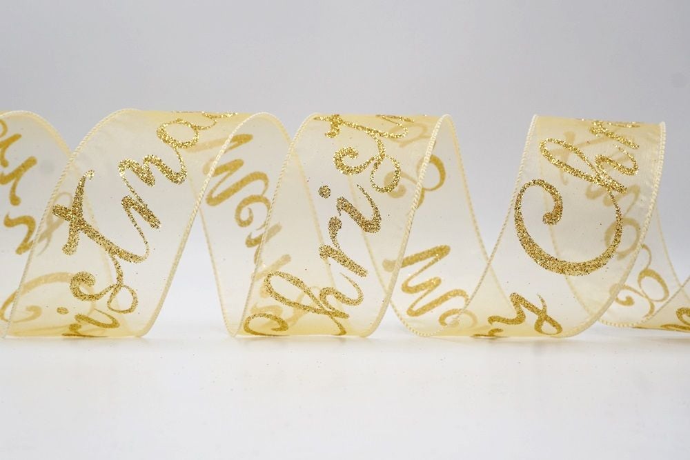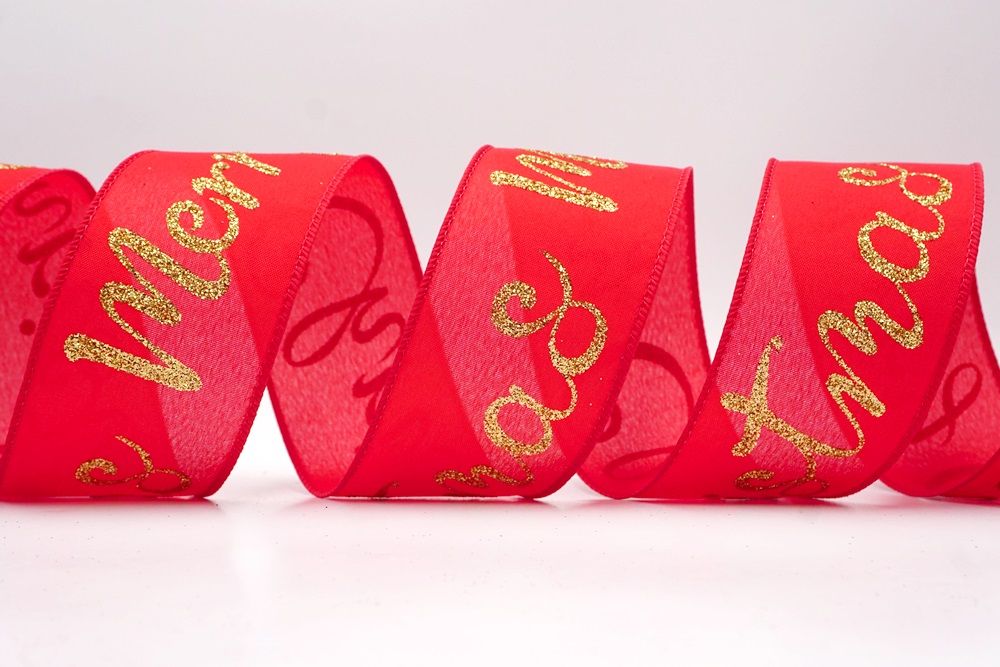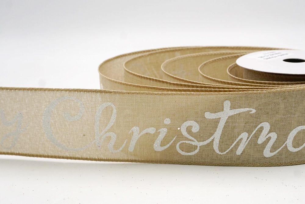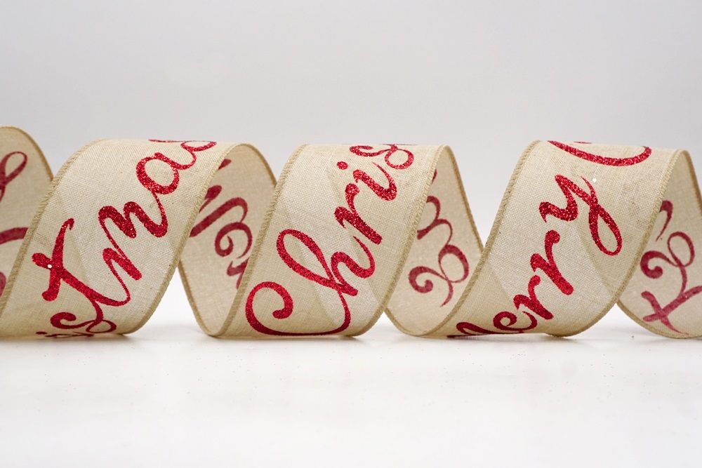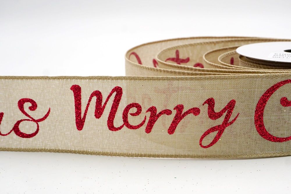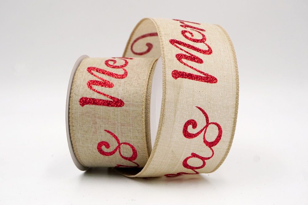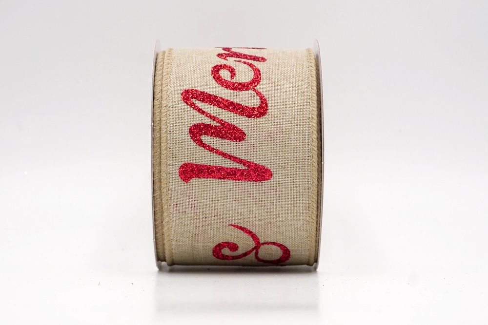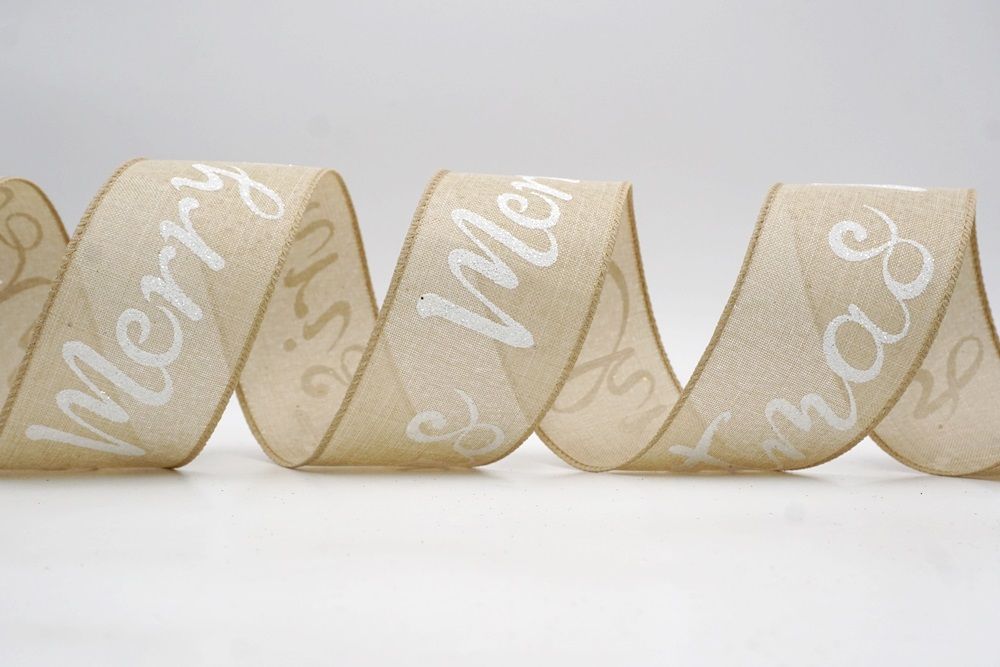 Spread the joy of the season loud and clear with the Merry Christmas Greeting Wired Ribbon. This collection is designed to literally wrap your home in good tidings, featuring the holiday’s most classic phrase scrolling elegantly across the fabric. The design versatility is stunning, offering choices to fit any theme: choose the translucent sheer fabric in red or gold for a sophisticated, glimmering look that catches the tree lights, or opt for the faux burlap in khaki and natural tones for a cozy, farmhouse aesthetic. There are also crisp plain weave options in white and cream that make the glittering red, green, and gold text pop with festive vibrancy. The typography varies from sweeping, romantic cursive scripts to playful mixes of block letters and swirls, ensuring that the "Merry Christmas" message feels personal and handcrafted rather than generic.
