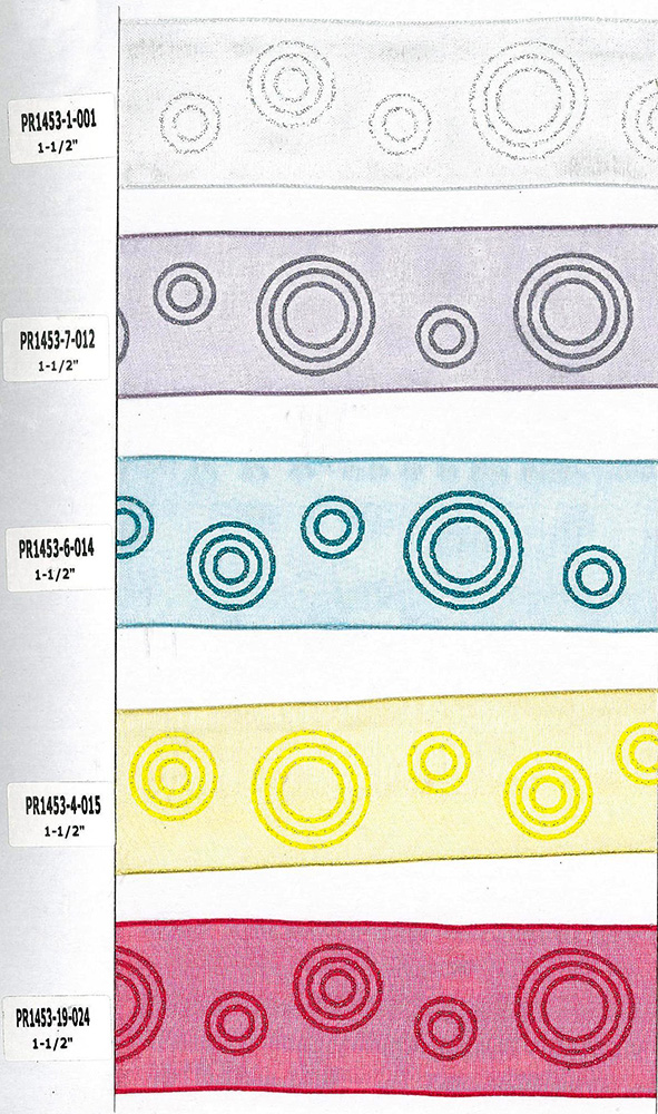 Polyester wired organza ribbon in 1-1/2 inch width features cute circles print. We mixed the colored ink with fine glitter to give the print a subtle sparkle. The wired edge is great for bows to hold their shape. There are many ribbon colors as well as print colors to choose from. This ribbon is great for bows, floral, wreath, gift wrapping and all occasion needs.