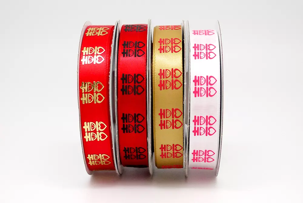 This ribbon is a 5/8 inch single faced satin with a cute style Chinese character print on it. This character symbolizes “good luck” and “double happiness” for marriage, and we changed the font a bit so there are hearts incorporated. The print can be done in matte ink or gold foil. Great for wedding gifts and decorations.