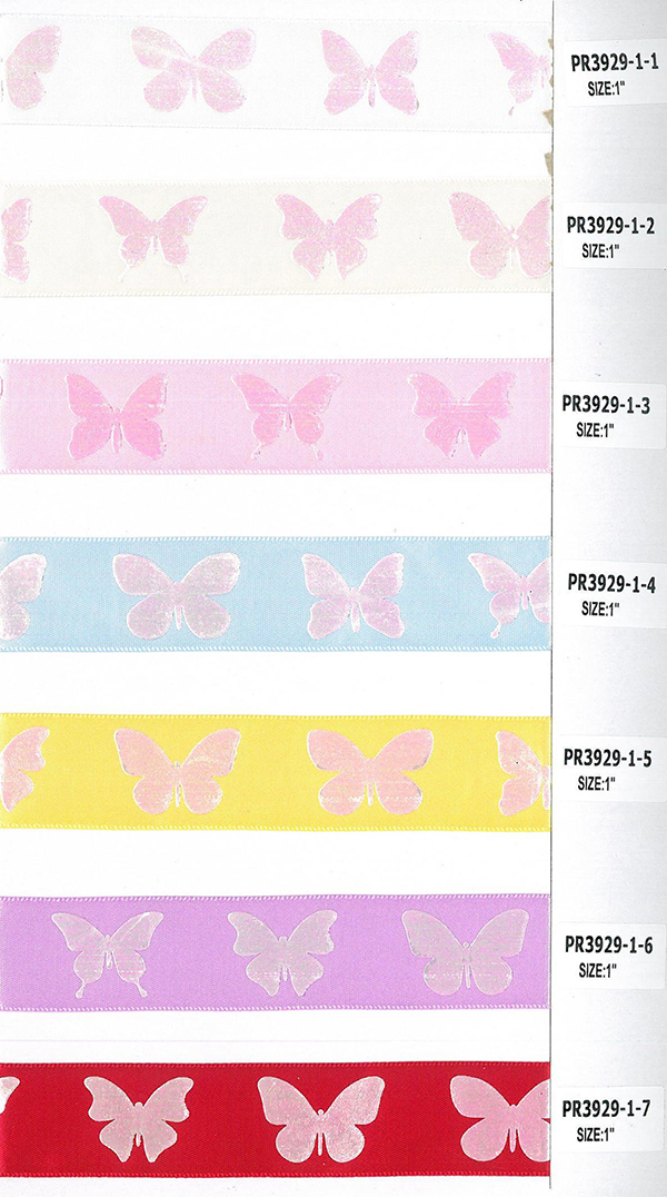 This 1 inch print ribbon has embossed butterfly in white iridescent color on polyester single faced satin. You can actually feel those butterflies! Custom or pantone colors can be made per request. This printed ribbon is great for spring and craft projects.