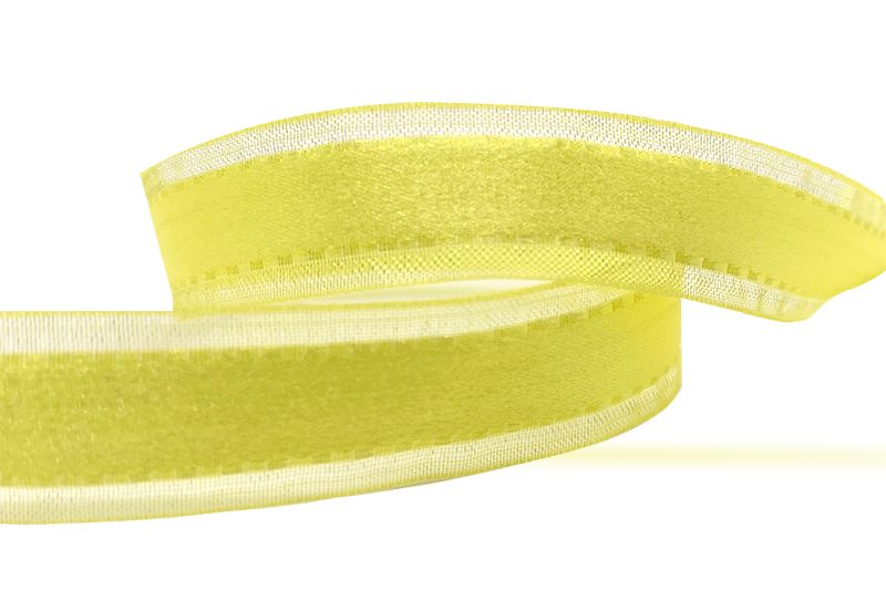 La cinta transparente con centro de satén está disponible en todos los anchos y en una variedad de colores. Está diseñada con una textura transparente en la tela base. Con satén en tonos joya en el centro, la cinta se ve impresionante en combinación con los bordes transparentes.