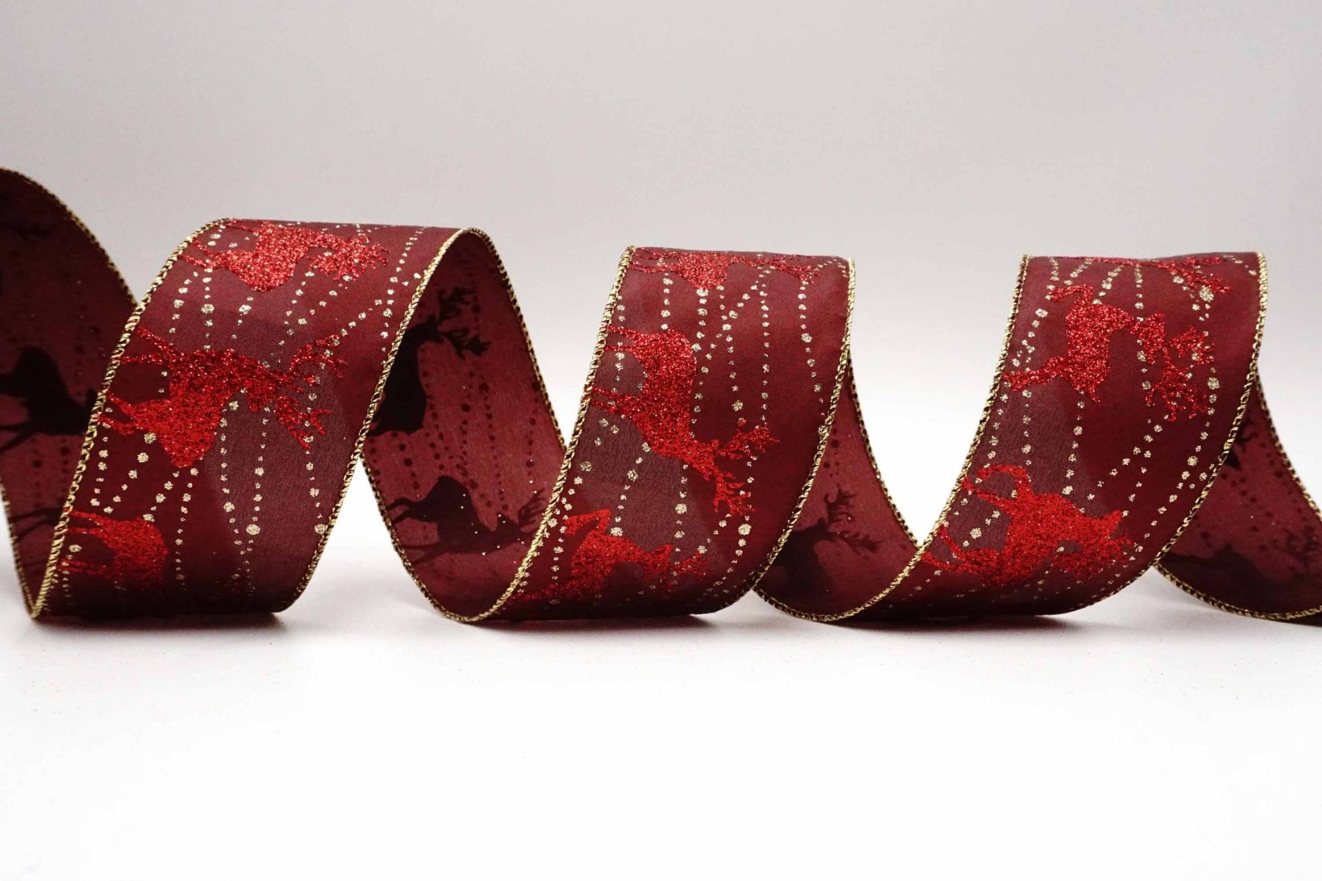 Esta cinta de renos saltarines está cortada de tela de satén con un ancho específico de 2.5”. Alambres están cosidos dentro de hilo metálico en los bordes. Como puedes ver, los patrones y bordes brillan en el fino satén. Esta lista puede ser una adición noble a cada escena navideña fácilmente. Además, al ser una cinta con alambre, se puede atar en lazos o coronas y mantener las formas.