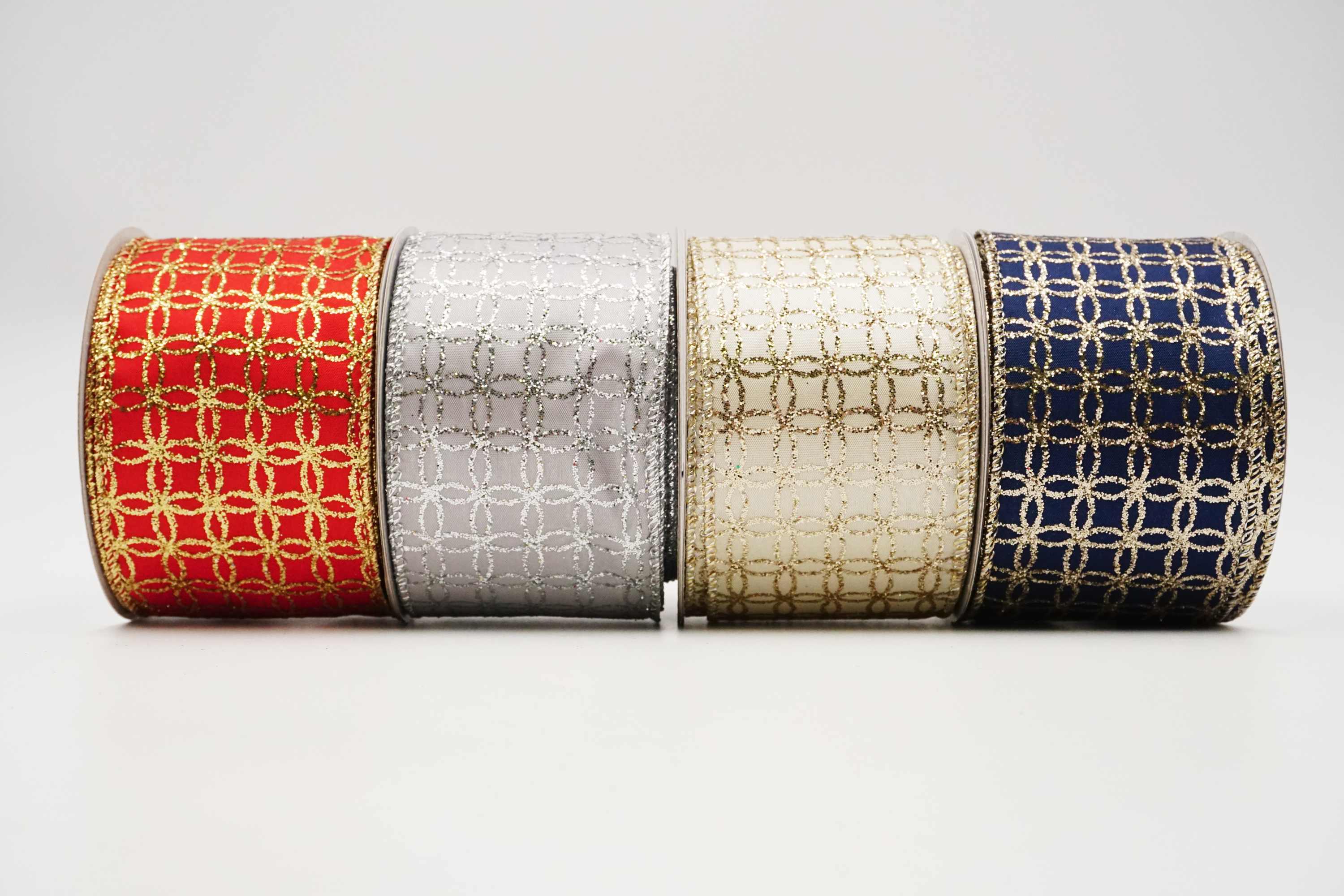 Los patrones geométricos modernos son ideales para agregar plenitud a su árbol o crear un lazo navideño contemporáneo. En esta serie de cintas, se encontrarán muchos elementos geométricos. Al observar más de cerca, descubrirá que las figuras geométricas en la cinta están incrustadas con purpurina dorada y plateada. Esta cinta de alambre con brillo geométrico en forma de copo de nieve está disponible en un tamaño específico de 2-1/2”. Tiene 3 opciones de tela y colores para ofrecer. Todas vienen con un borde de alambre de merrow de diferente color en el lado que ayuda a que la cinta y su lazo mantengan su forma. Las figuras geométricas en la cinta están dispuestas como copos de nieve, con un toque navideño en una atmósfera moderna.