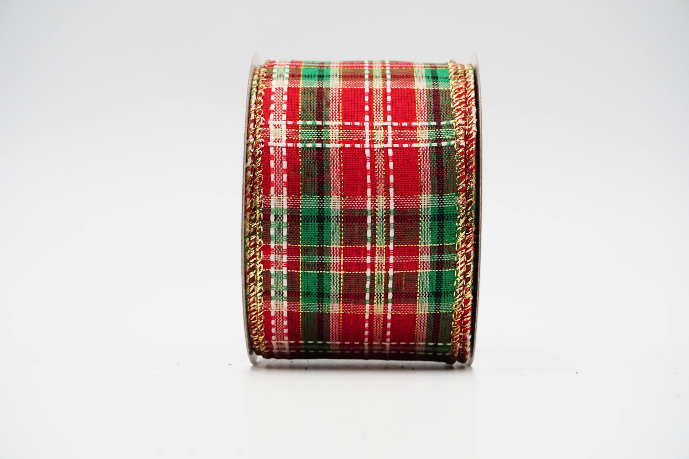 Esta serie de cintas está disponible en todos los tamaños desde 1-1/2 pulgadas en adelante. Este diseño festivo de cinta a cuadros de colores vivos tiene dos opciones de bordes, uno de los bordes con alambre está cosido con hilo dorado metálico para darle un toque final brillante. Esta cinta mantiene su forma maravillosamente, por lo que es perfecta para hacer lazos grandes.