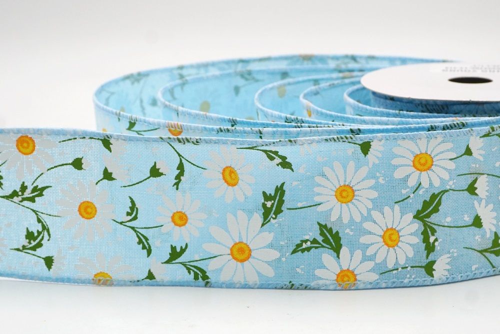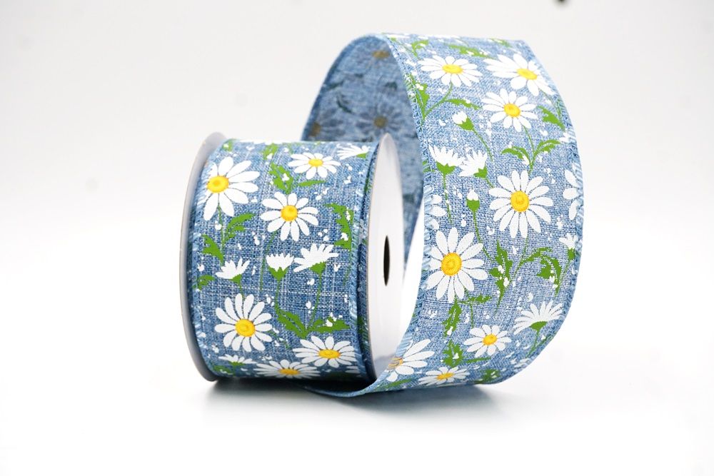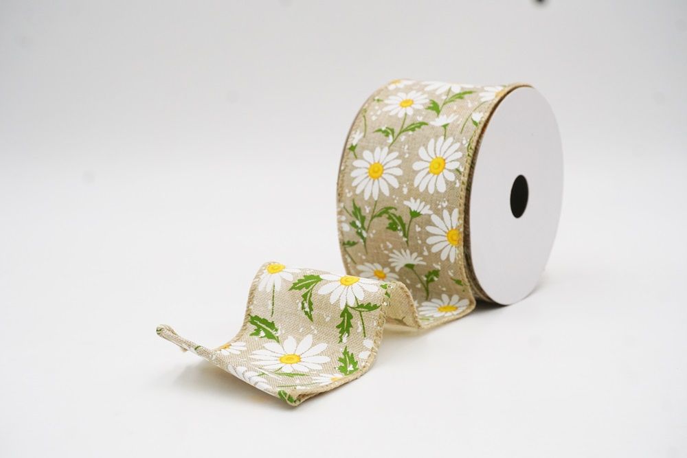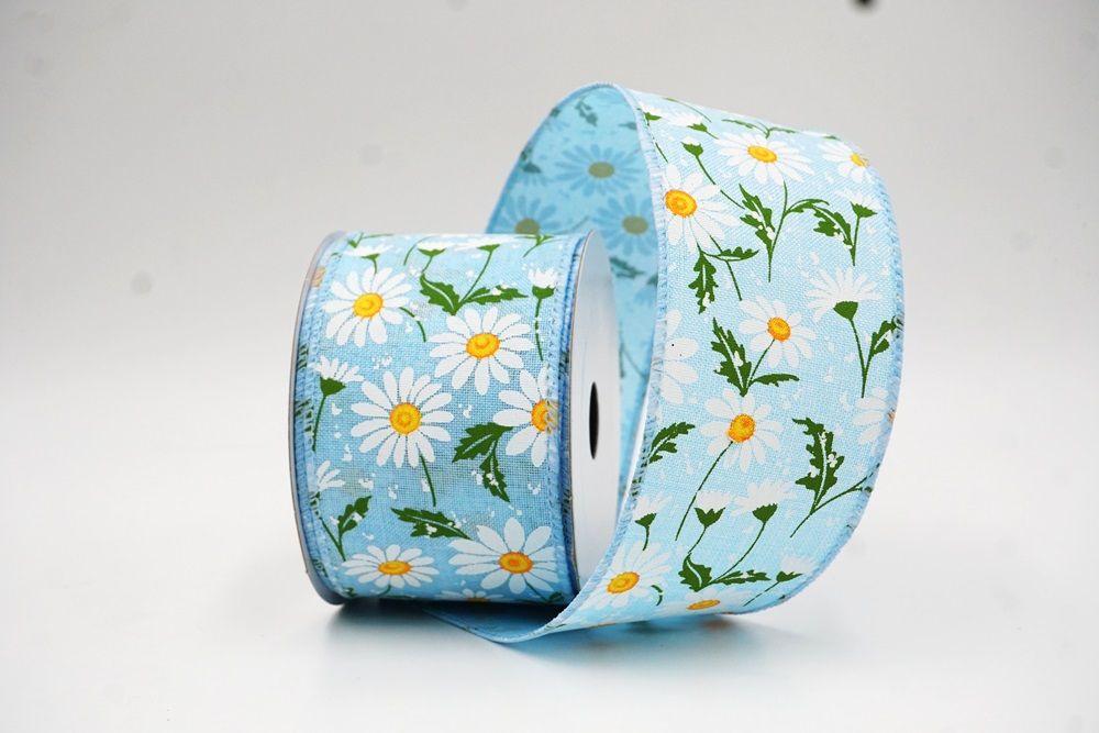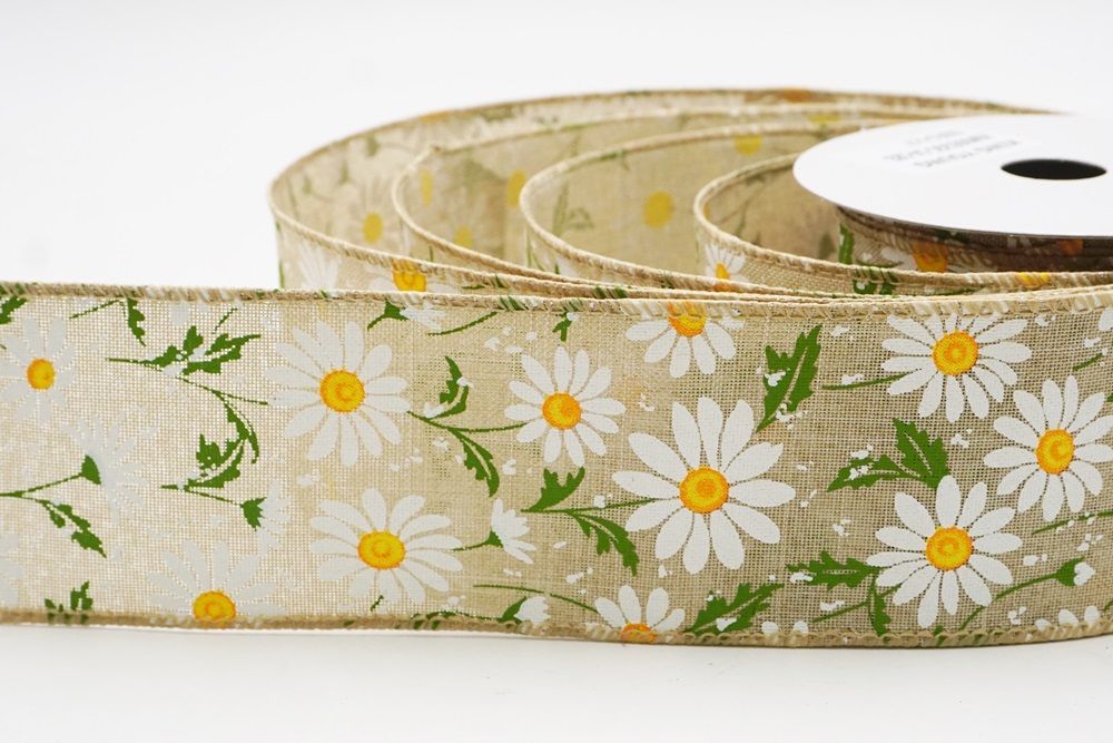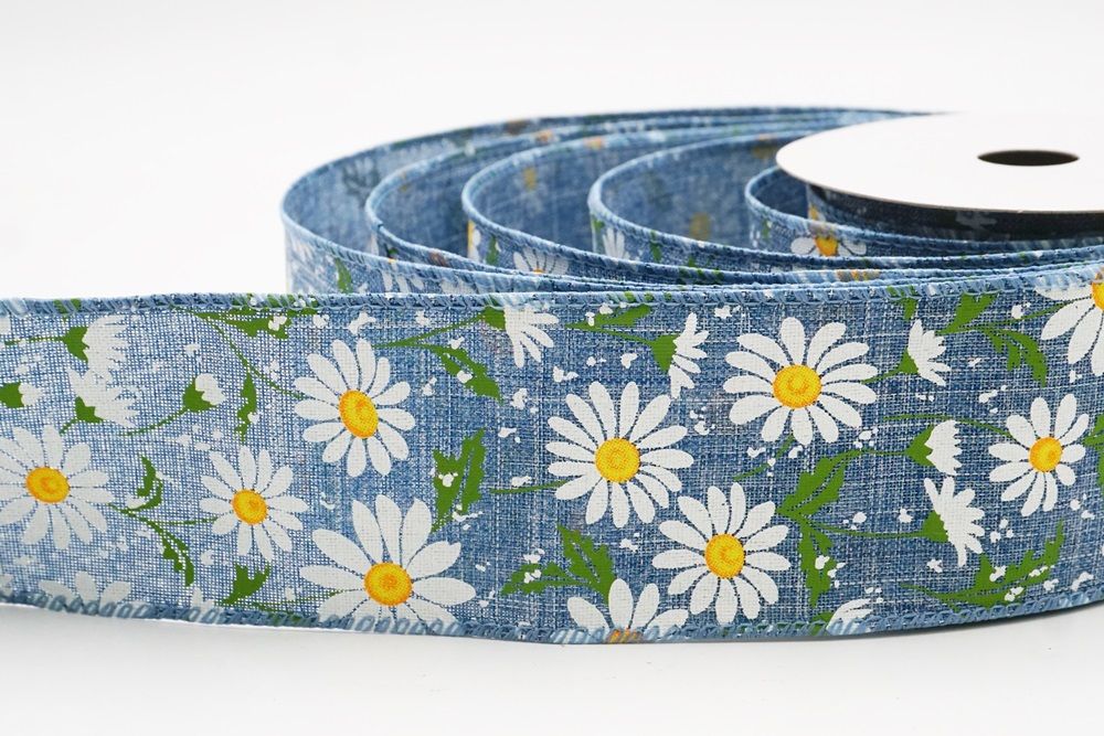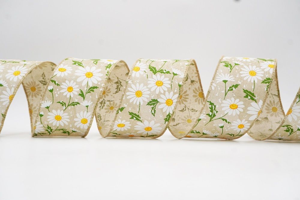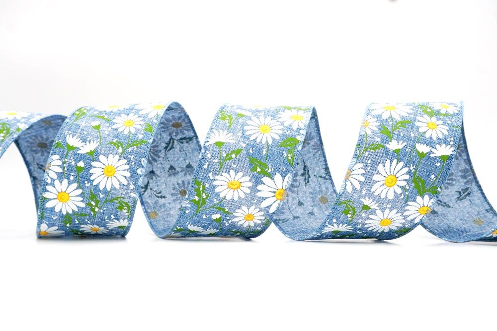 Captura la esencia de la primavera con la cinta de alambre de flor margarita en flor, disponible en tamaños que van desde 1 pulgada hasta 2.5 pulgadas de ancho. Elaborada con yute sintético, esta cinta añade un toque rústico pero encantador a tus creaciones de primavera. Adornado con delicadas flores de margarita en una variedad de vibrantes colores de primavera, incluyendo azul mezclilla, rosa, amarillo, púrpura, azul bebé y verde claro, este lazo irradia la frescura y vitalidad de la temporada.