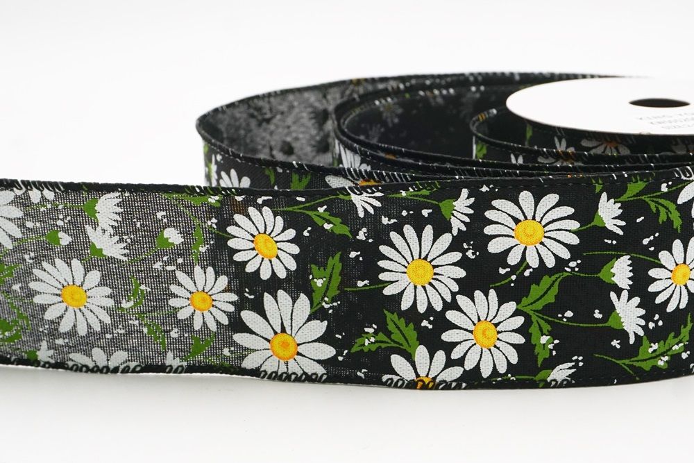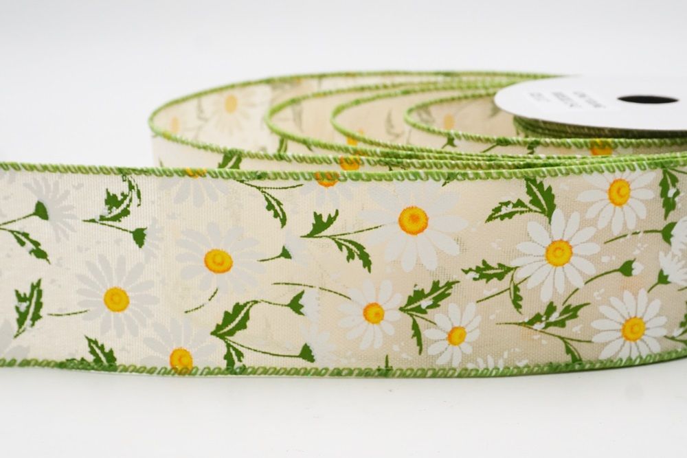La cinta de alambre de campo de margaritas silvestres de primavera presenta encantadoras flores de margarita impresas en una tela de yute sintético texturizada, creando un aspecto brillante y natural de primavera. Este diseño está disponible en 11 colores: Blanco, Crema, Denim, Rosa, Amarillo, Púrpura, Azul Claro, Marrón Claro, Caqui, Verde Manzana y Negro, lo que permite a diseñadores y minoristas combinar diferentes temas estacionales y estilos decorativos. Los bordes con alambre proporcionan una excelente flexibilidad para dar forma a los lazos y mantener diseños estructurados.