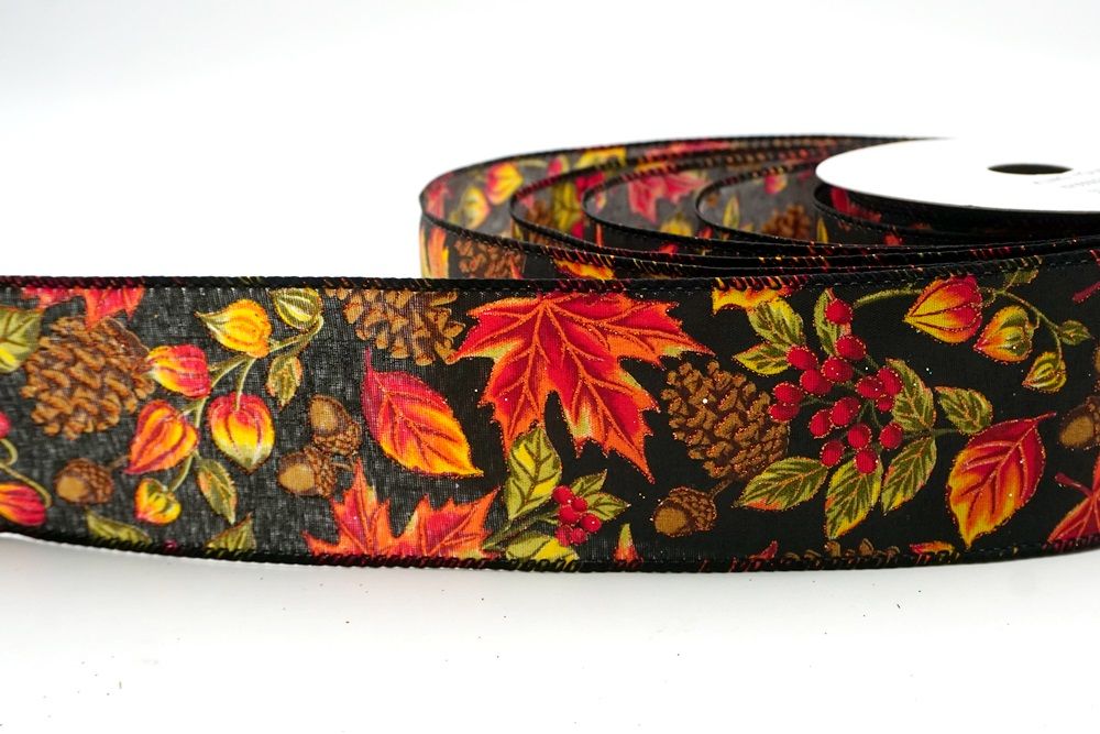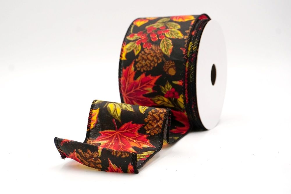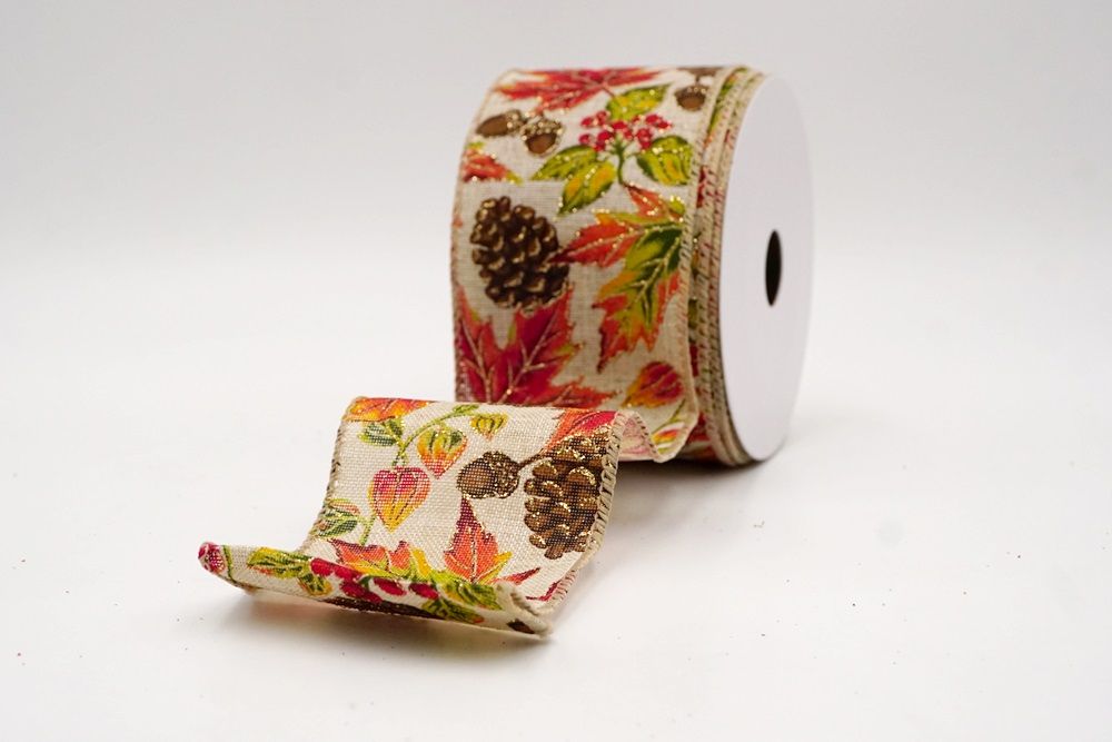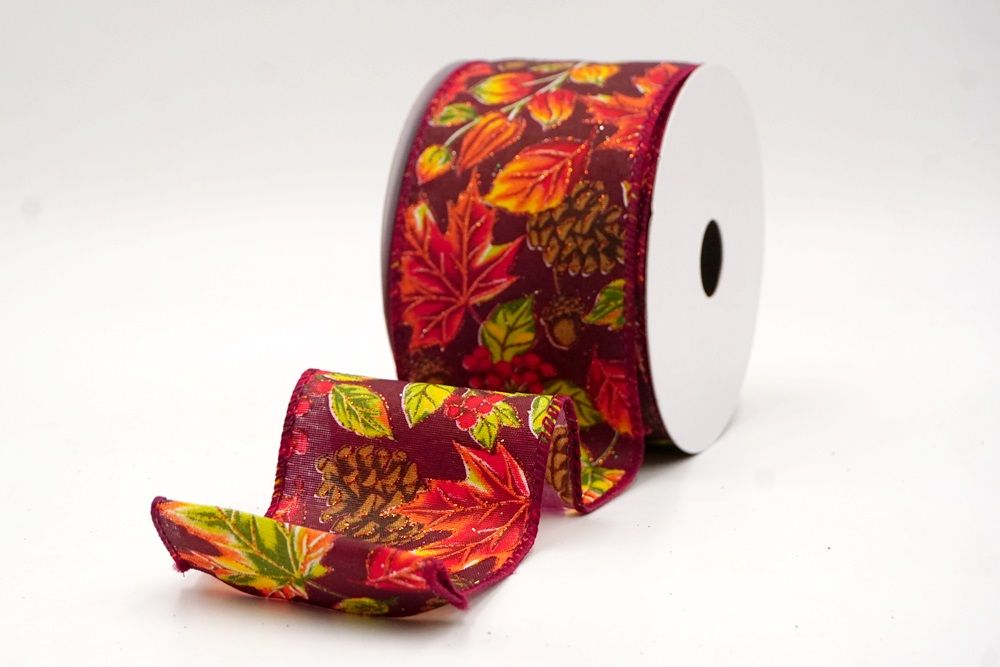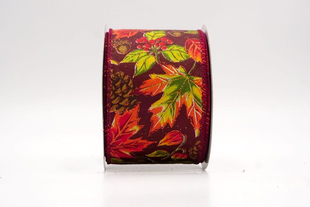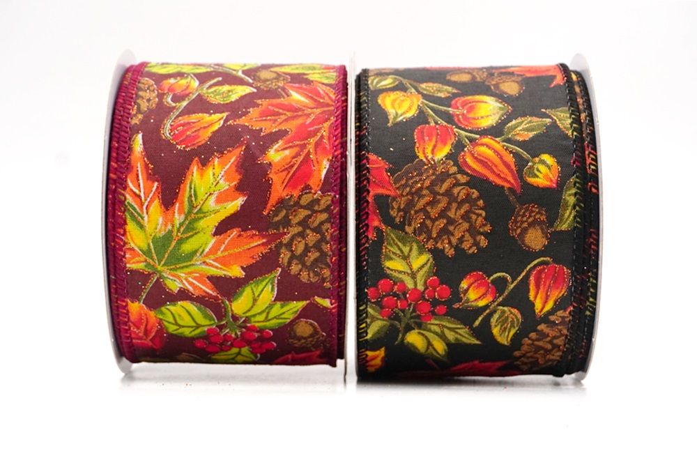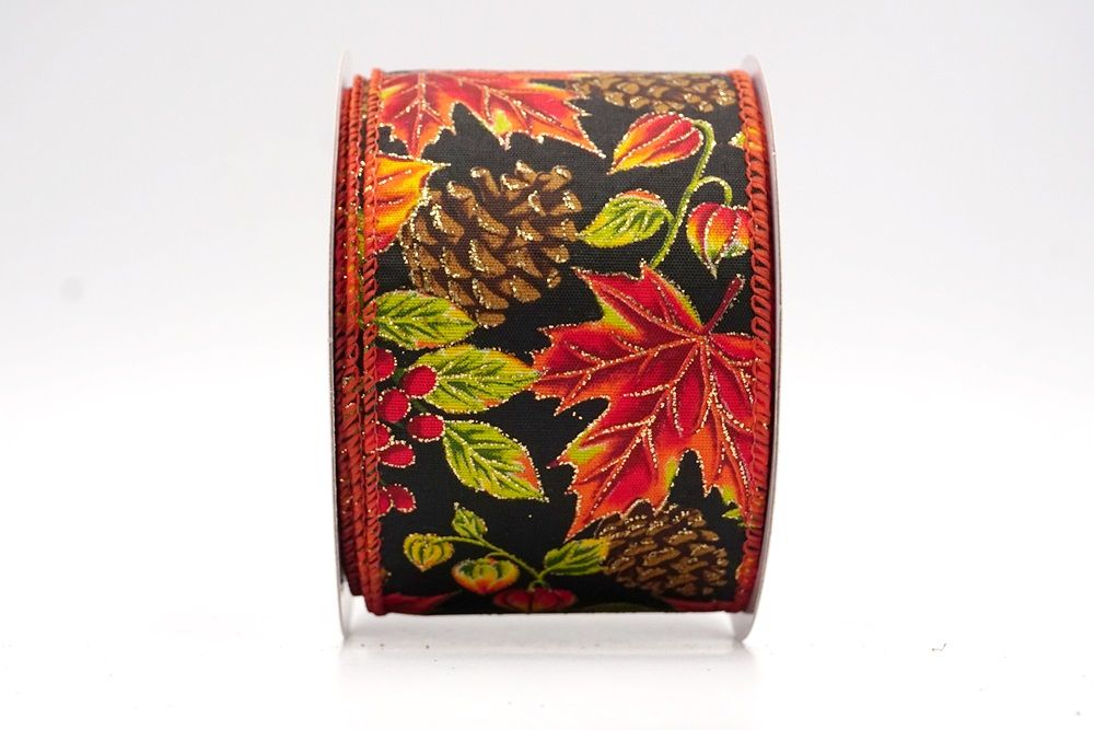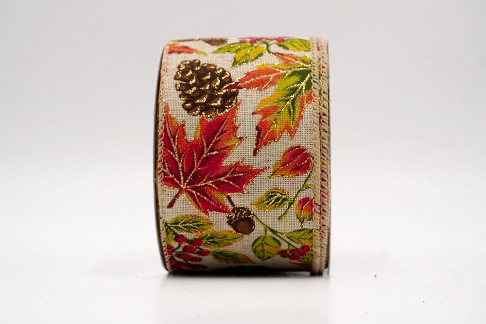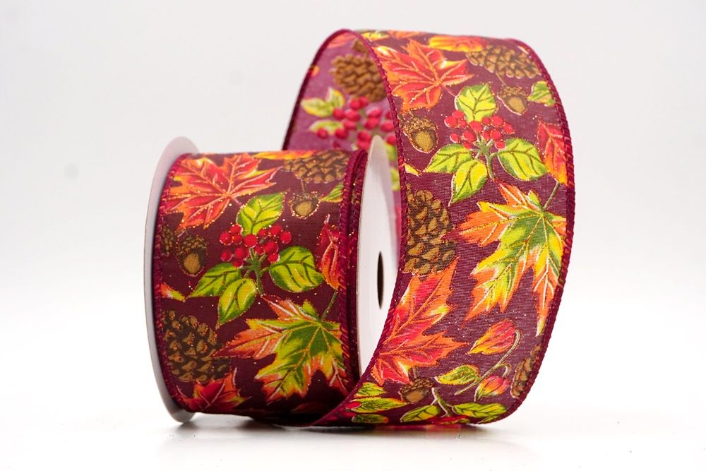 Kimalteleva syksyn nauha, joka esittelee kimalteista vaahteranlehteä ja käpykuviota, lisää upeaa kiiltoa kauden luomuksiisi.
