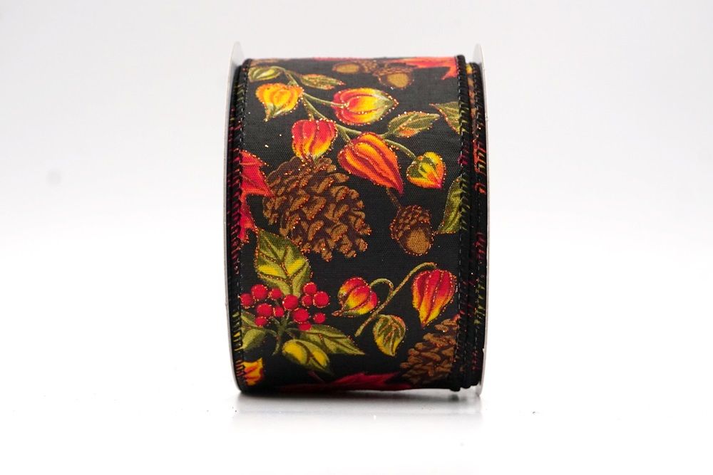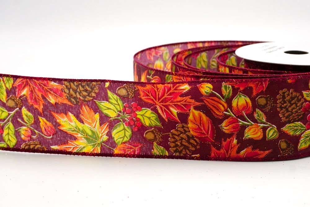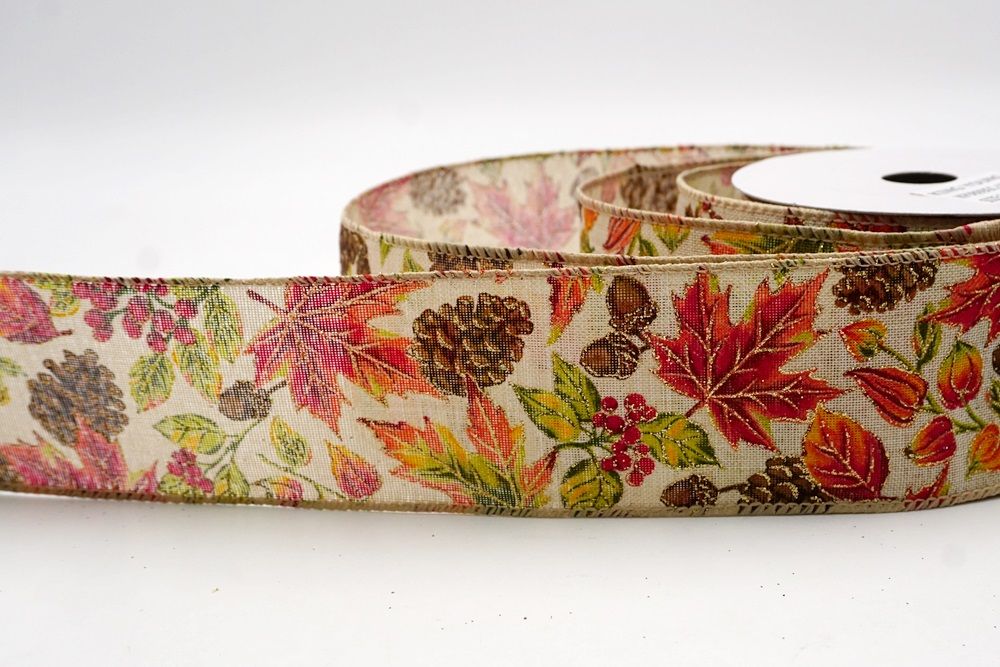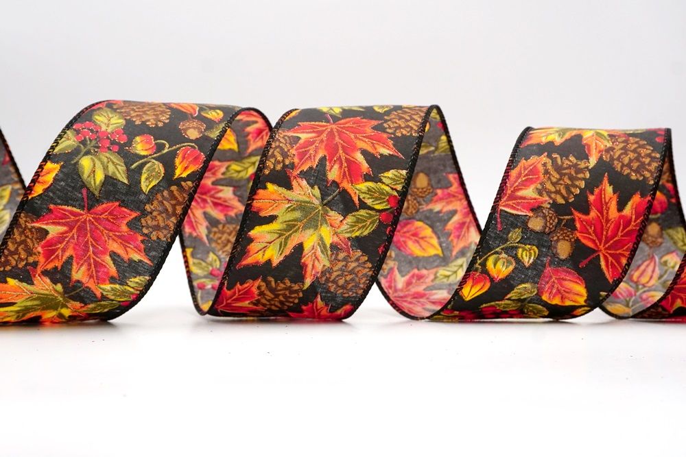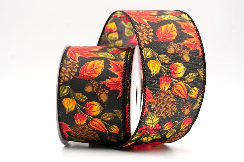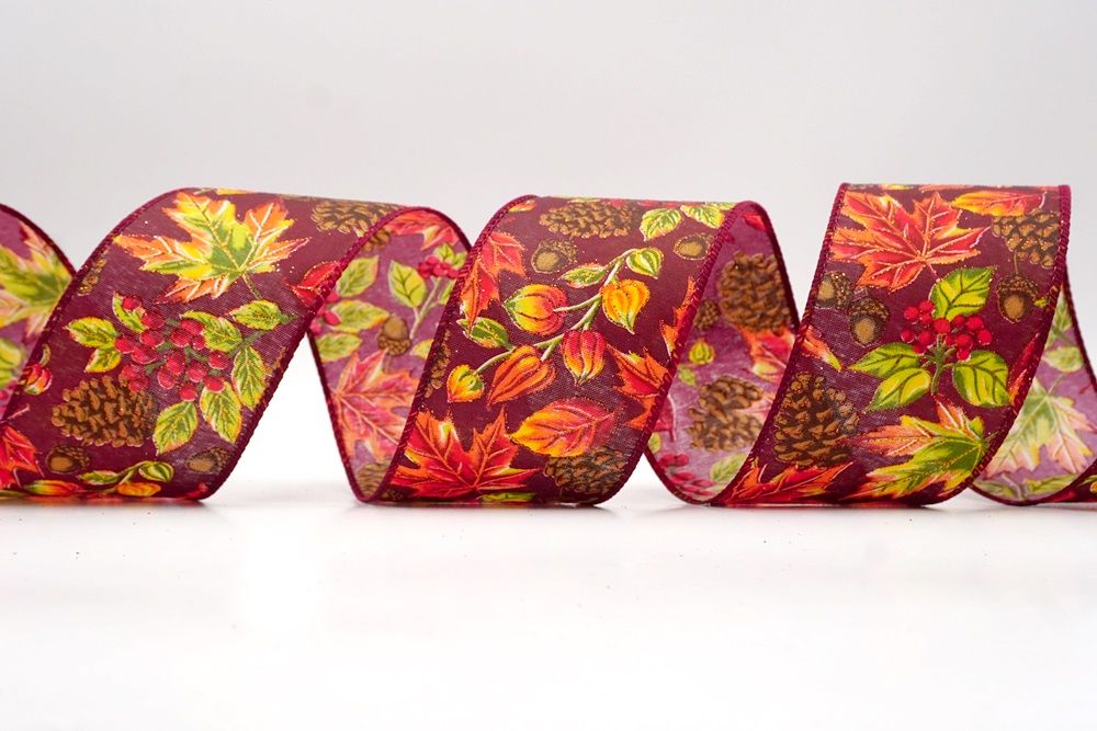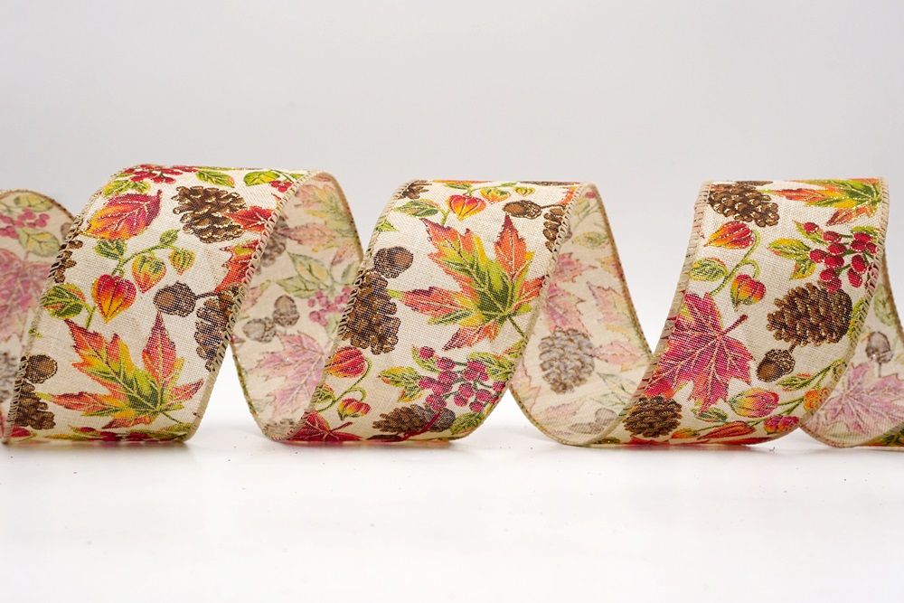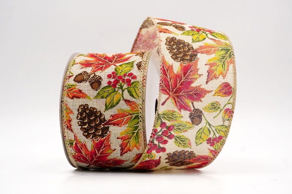 Nauhan suunnitelmat yhdistävät kauniissa myöhäissyksyn metsäkävelyssä esiintyviä yhteisiä elementtejä. Esillä ovat suuret, klassiset vaahteranlehdet, jotka on pölytetty hienolla kimalteella, mikä auttaa niitä vangitsemaan valoa kauniisti. Lehden seassa on kestäviä käpyjä, jotka tarjoavat tummemman, kontrastisen muodon, joka juurruttaa kuvion. Lehden värit vaihtuvassa vuodenaikassa, kuten syvä punainen, lämmin oranssi ja rikas kulta, erottuvat kauniisti valitun taustasävyn kanssa. Pienemmät luonnolliset yksityiskohdat, mukaan lukien pieni tammenterho ja pieni tumma oksa, on levitetty kankaan pinnalle, täydentäen metsäpohjan ilmeen. Koska nauhassa on joustava langanreuna, sitä on helppo taivuttaa, muotoilla ja kiinnittää täydellisiin silmukoihin tai dramaattisiin häntiin. Lanka auttaa nauhaa säilyttämään muotonsa hyvin, mikä tekee siitä suosikin floristeille, jotka tarvitsevat kaarensa pysyvän muodossaan pitkään.
