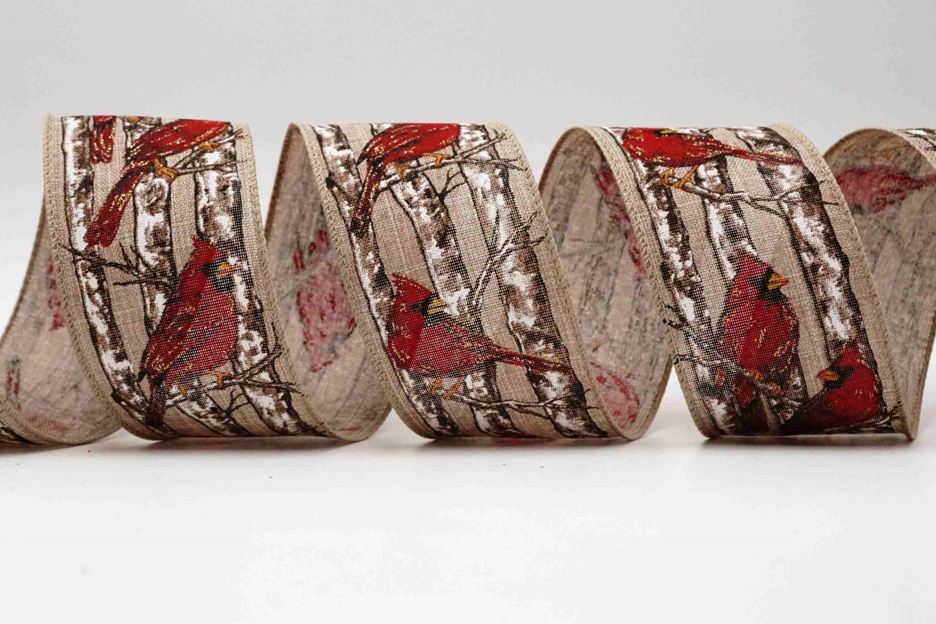 Tämä nauha sisältää punaisia kardinaalilintuja, joita koristavat huurteinen lumi ja kultaiset kimalteet. Se on saatavilla kolmella eri taustavärillä, jotka muistuttavat jäljitelmäpellavakangasta ja joissa jokaisessa on eri värisiä puunoksia.