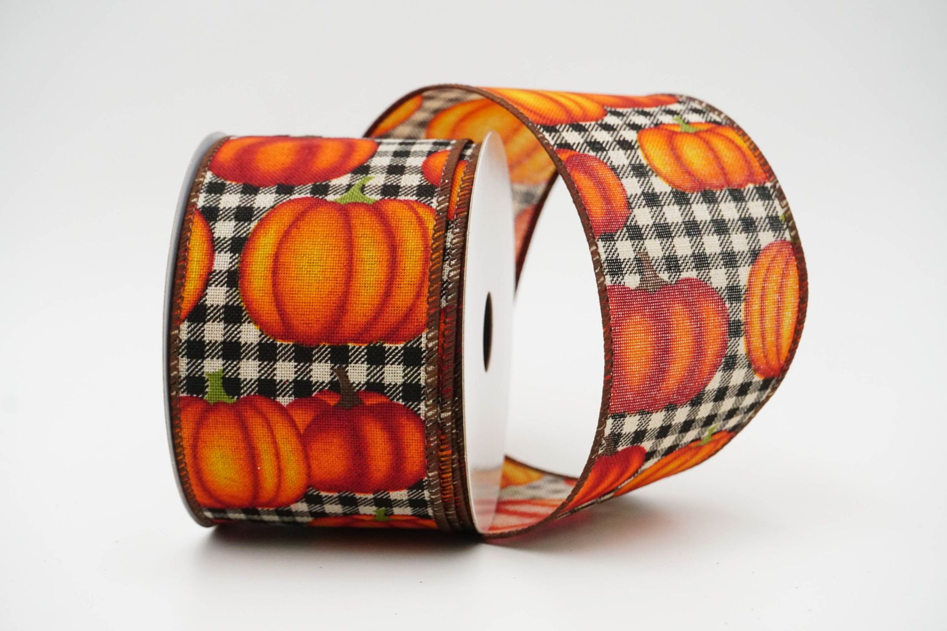 Yhdysvalloissa kurpitsat kuuluvat syksyn juhliin, kuten Halloweeniin ja Kiitospäivään. Oranssi kurpitsa, joka korjataan lokakuussa, ja monet amerikkalaiset sisällyttävät kurpitsapiirakan Kiitospäivän aterioihinsa. Tämä ilmoitus esittelee tukevan näköisiä kurpitsoja, mikä tarkoittaa, että tämä vuosi on hedelmällinen uusi vuosi. Tämän vuoden sadon pitäisi olla hyvä! Katso tarkemmin kurpitsoihin, niin löydät muodon, joka on ääriviivoitettu kultahipuilla, ja niiden päälle on painettu eri sävyisiä värejä, jotta ne olisivat kirkkaampia. Kiemuraiset viiniköynnökset vihreinä ovat täynnä energiaa. Isoja ja pieniä kurpitsoja on pinottu. Nauha on leikattu paksusta taftikankaasta, ja se on 2,5 tuumaa leveä, kun sen reunat on ommeltu langoilla tai metallilangalla. Taustavärit ovat khaki ja beige. Ne luovat paitsi rustiikkisen ilmeen myös valaisevat syksyn tunnelmaa.