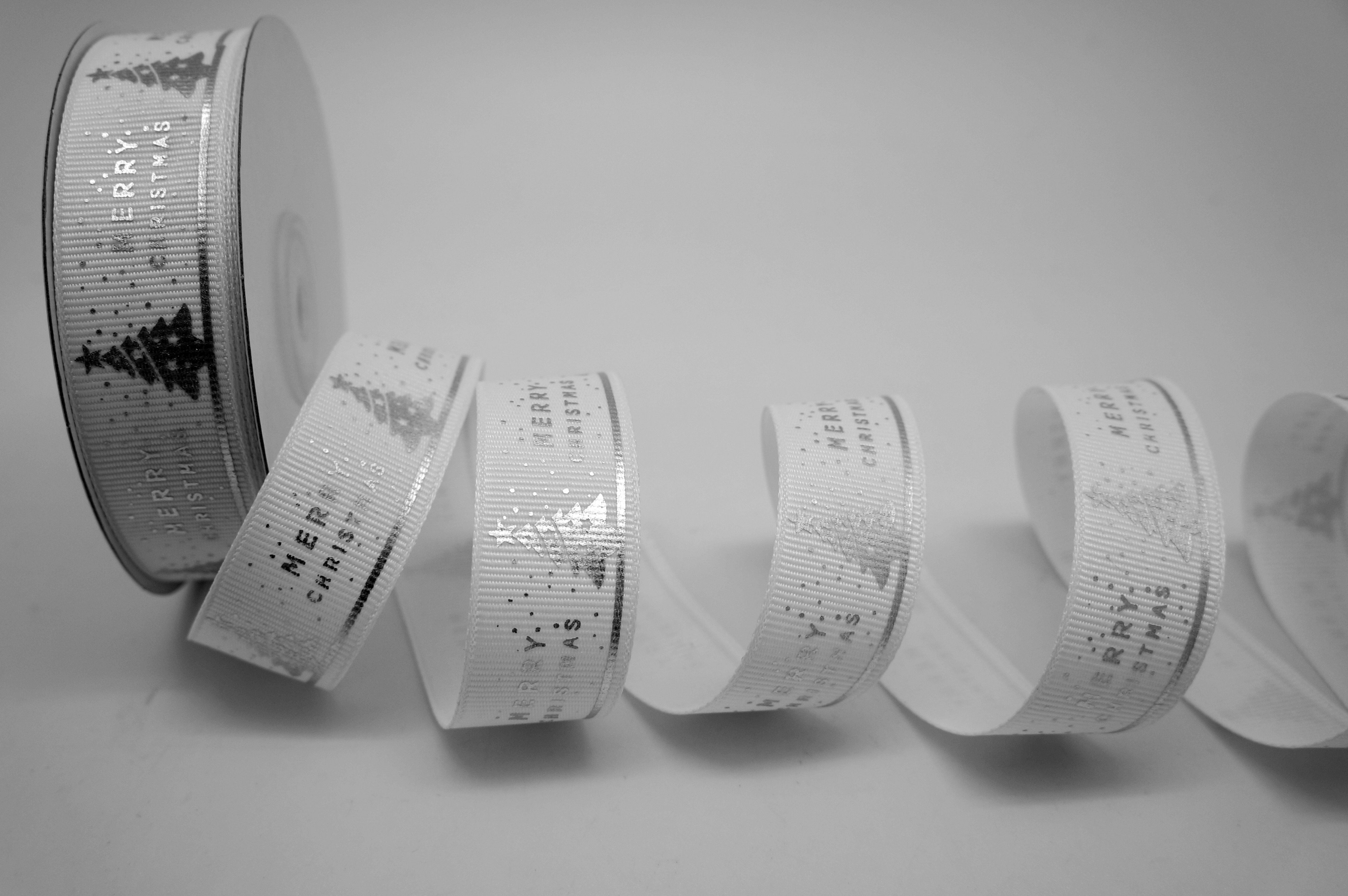 Ce magnifique ruban en gros-grain imprimé à la feuille de Noël est disponible en or sur noir, or sur chocolat, argent sur blanc et plus encore à découvrir.