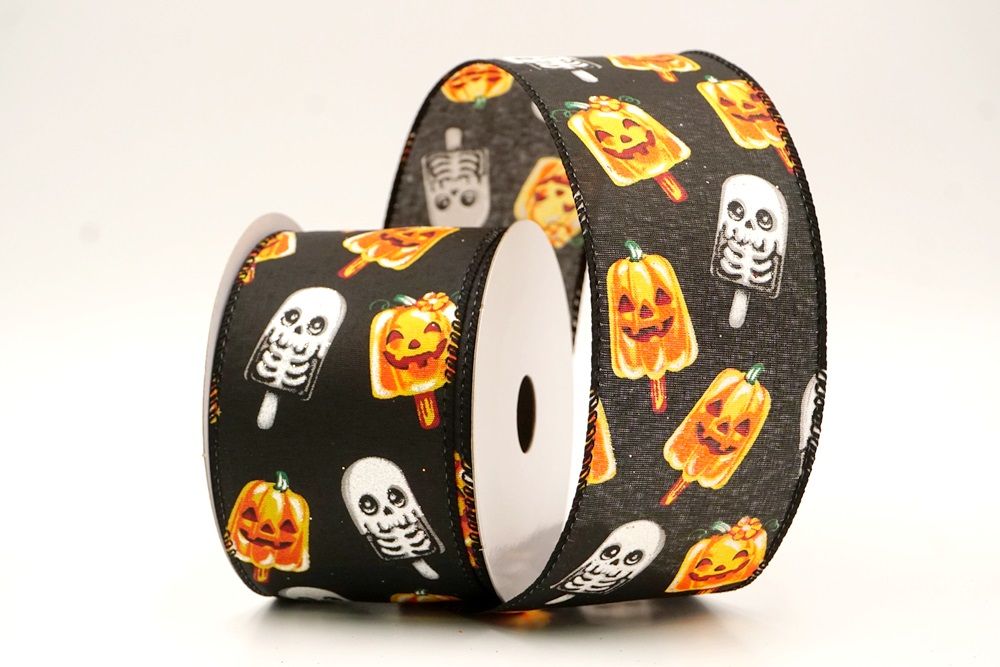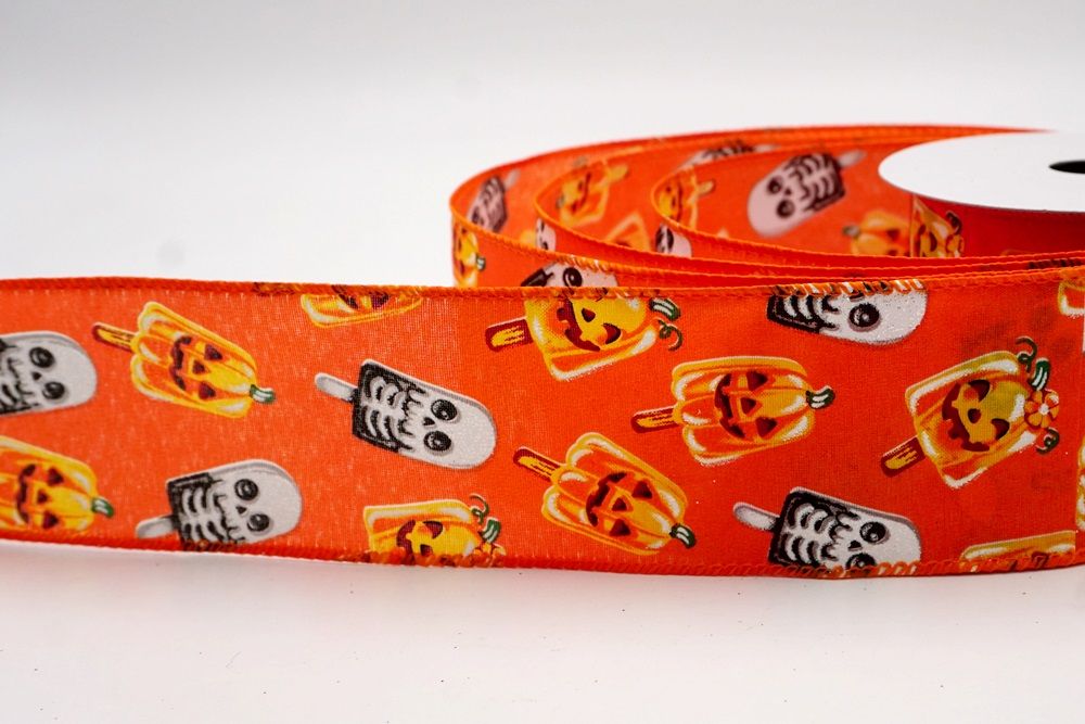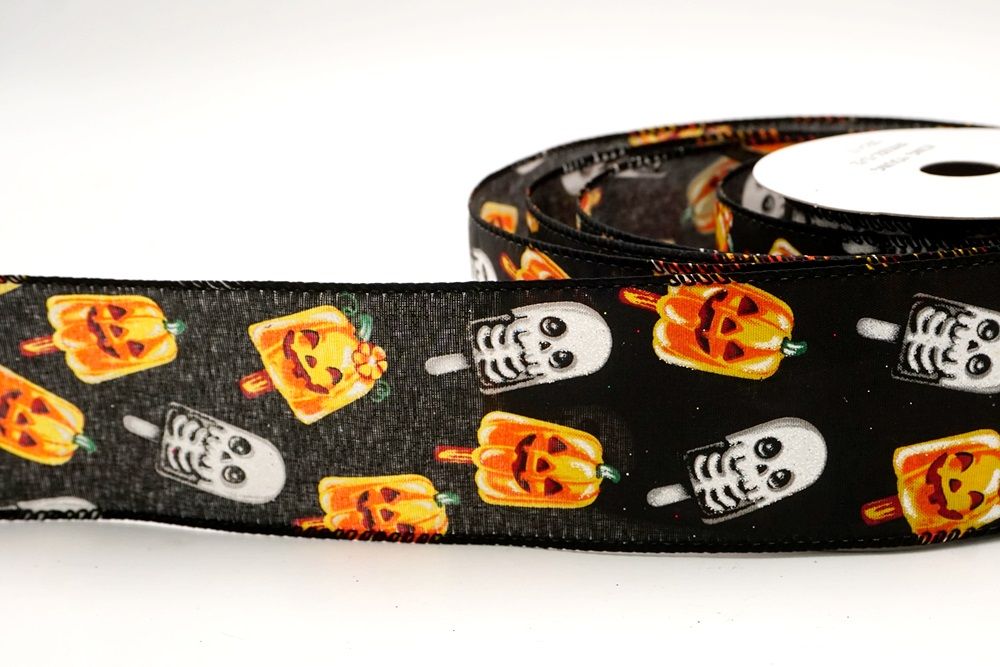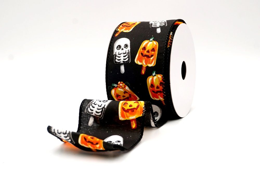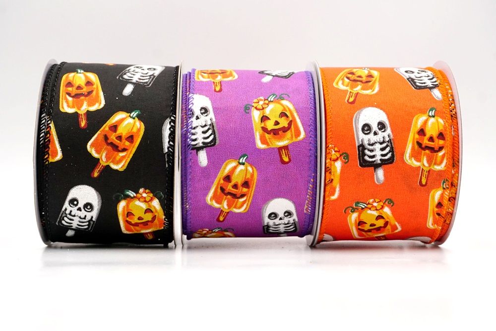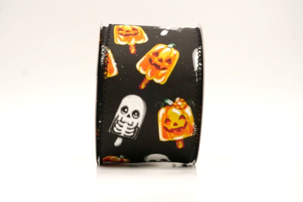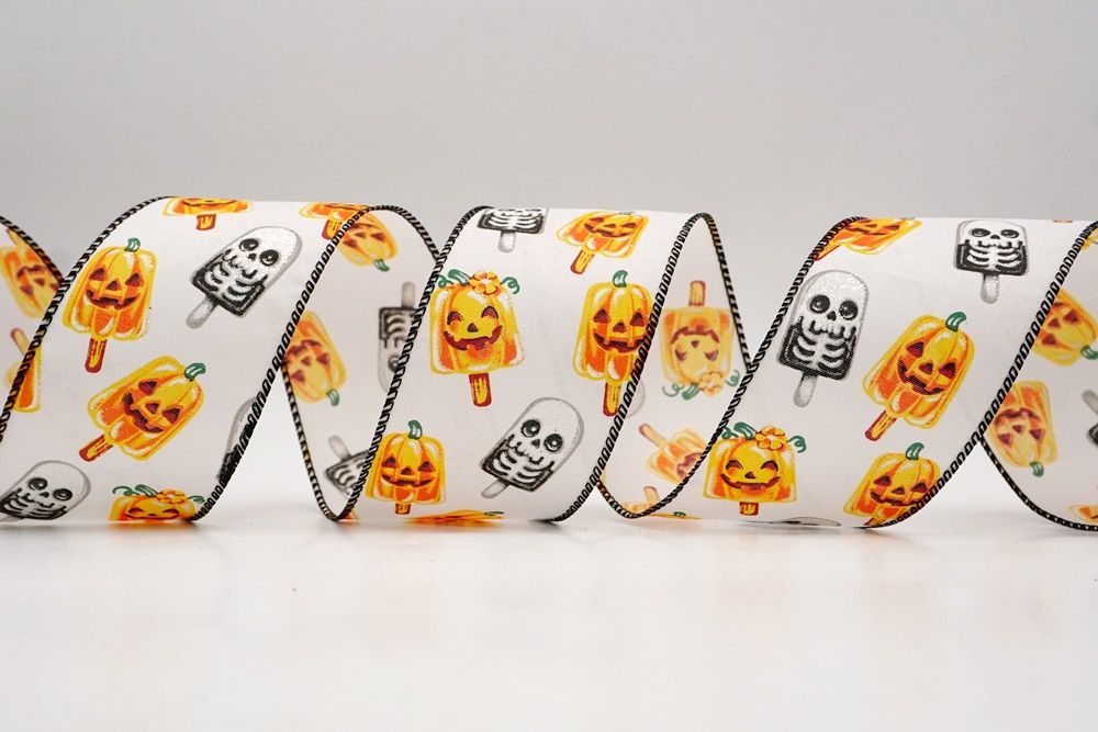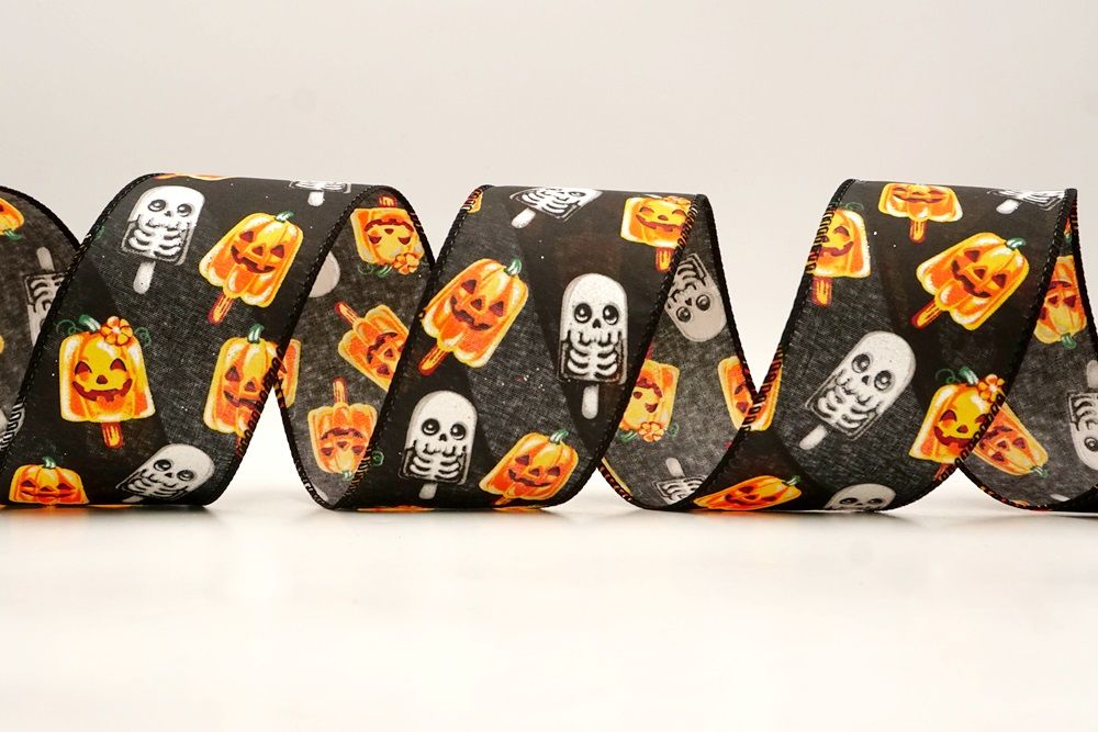 रिबन पर डिज़ाइन विभिन्न हैलोवीन-थीम वाले जमे हुए नाश्ते को पृष्ठभूमि के रंग में बिखरे हुए दिखाता है। विशेष रूप से बड़े, मुस्कुराते हुए चेहरे के साथ संतरे के कद्दू के आकार को प्रमुखता से प्रदर्शित किया गया है, जिसे एक स्टिक पर पॉप्सिकल की तरह दिखने के लिए डिज़ाइन किया गया है। ये खुशमिजाज कद्दू सफेद कंकाल पॉप्सिकल के साथ जोड़े गए हैं, जिनके चेहरे पर एक गहरा, कार्टून जैसा हड्डी का ढांचा है, जो थोड़ा डरावना लगता है। दो अलग-अलग पॉप्सिकल छवियाँ कपड़े पर यादृच्छिक रूप से दिखाई देती हैं। रिबन की सीमा, जब मौजूद होती है, अक्सर उज्ज्वल, व्यस्त केंद्रीय छवि को फ्रेम करने के लिए एक ठोस रंग का उपयोग करती है। चूंकि रिबन के किनारे पर तार है, इसे विशेष आकार में मोड़ना आसान है और यह अपनी जगह पर अच्छी तरह से रहता है। तार विभिन्न सामग्रियों, जैसे कि फोम व्रथ बेस या एक मजबूत सजावटी शाखा पर रिबन को सुरक्षित करने के लिए सहायक है।